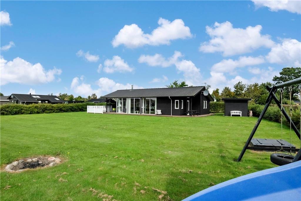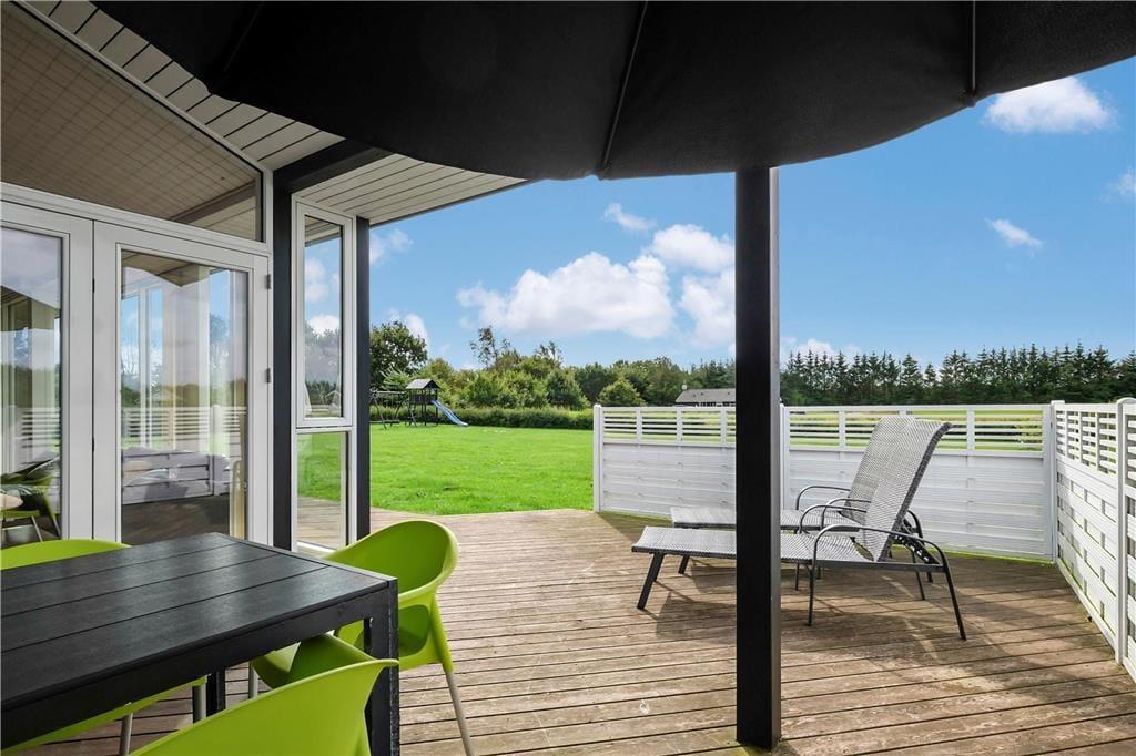Huset ligger på en fin havegrund med masser af plads til boldspil og leg og på de store åbne og overdækkede terrasser, kan man dase, hygge og grille på livet løs. Huset ligger i pæn afstand til større veje, så der er god mulighed for fred og ro, så trætte batterier kan lades grundigt op.
