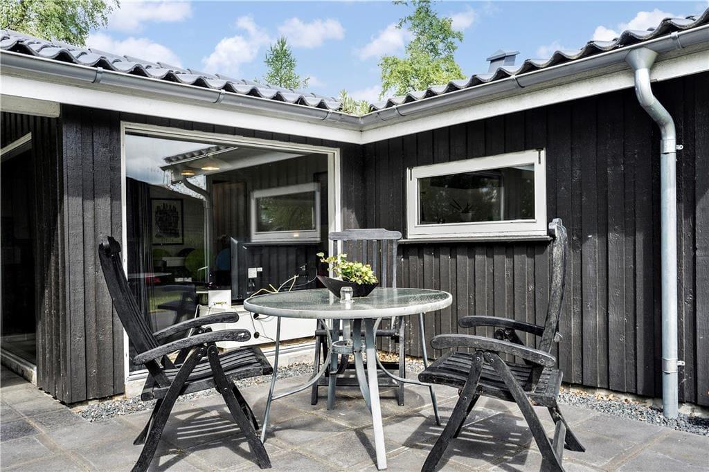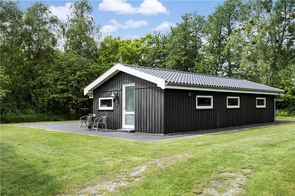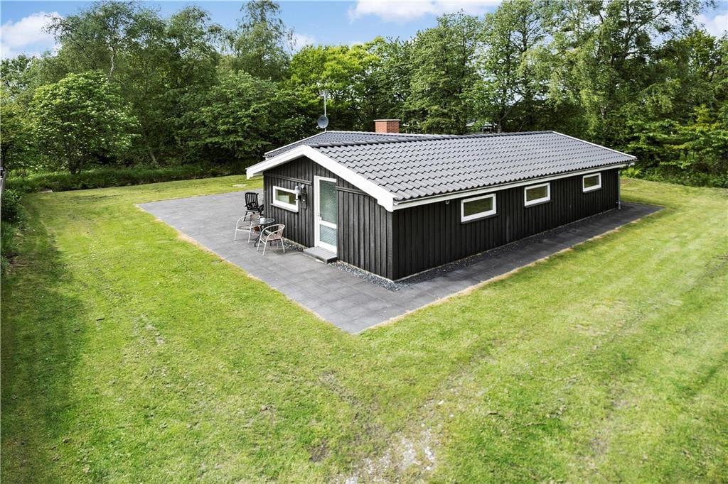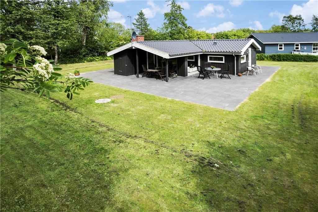 Sommerhuset ligger på en dejlig havegrund omgivet af høje træer på tre sider. Der er plads til leg og boldspil på græsplænen, og fliseterrassen løber rundt om hele huset. På bagsiden kan man sidde helt i fred og ro og nyde sommeren og solen, mens den overdækkede del er ideel til aftenhygge med en kop kaffe eller et godt glas vin.