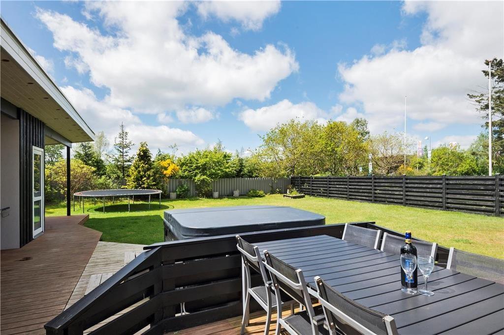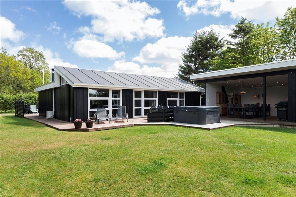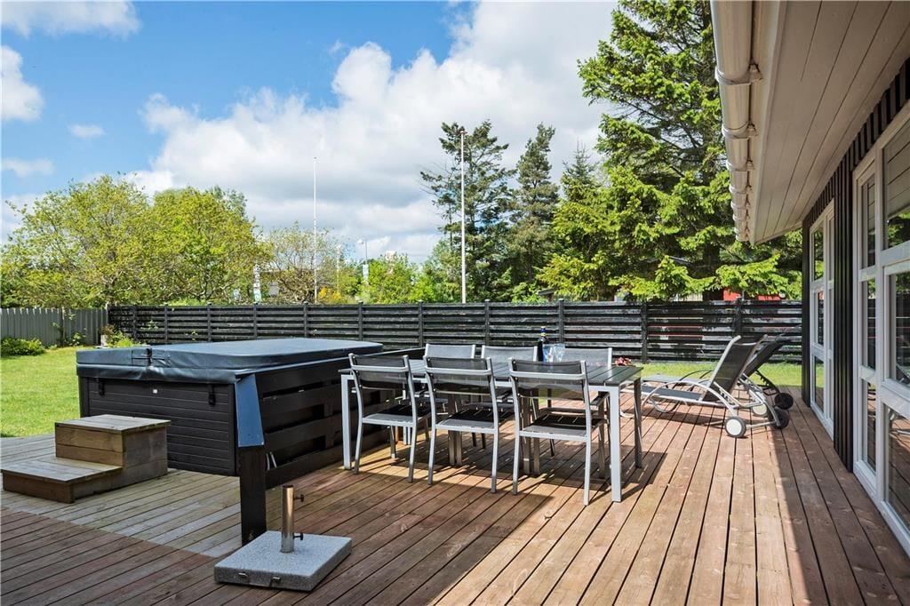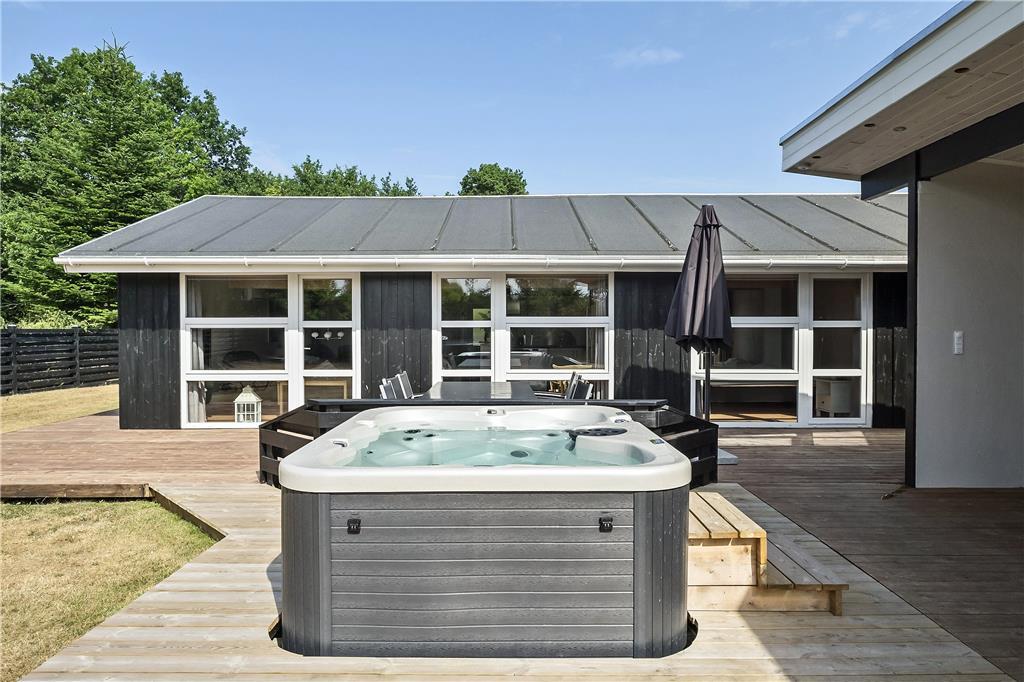 Når du træder ud på den store, overdækkede terrasse, får du virkelig følelsen af ferie. Her er der rig mulighed for at nyde solens varme eller søge skygge, alt efter hvad du foretrækker. Den overdækkede terrasse skaber et beskyttet udendørsrum, som kan bruges hele dagen – hvad enten du vil spise ude, læse en bog eller bare slappe af med en god kop kaffe. I den hyggelige have kan du nyde stilheden og fuglesangen, og den udendørs standspa inviterer til afslapning og velvære. Forestil dig at tage en opfriskende dukkert i spaen på en varm sommerdag eller efter en lang gåtur langs kysten – det bliver ikke meget bedre!