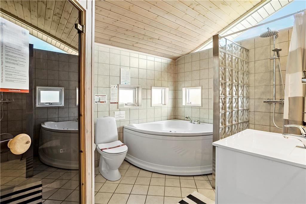 Husets hjerte udgøres af det nydelige, moderne køkken, spisestue og en stor, lys stue med behagelige og pæne møbler, samt en hyggelig brændeovn. Der er tre soveværelser hvoraf et har dobbeltseng et andet har dobbeltseng med enkeltkøje ovenover,det sidste soveværelse har to enkeltsenge, som kan skubbes sammen til dobbeltseng, hvis det ønskes. I forbindelse med spiseafdelingen er der en hyggelig alkove med dobbeltopredning og der er også plads til, at der kan sove to personer på hemsen. Der er et stort badeværelse med spabad til 2 personer, samt en fantastisk sauna. Der ud over er der et gæstetoilet, så morgenkøen kan deles i to og så teenagedatteren kan tage et langt bad uden at lave ridser i feriehumøret.