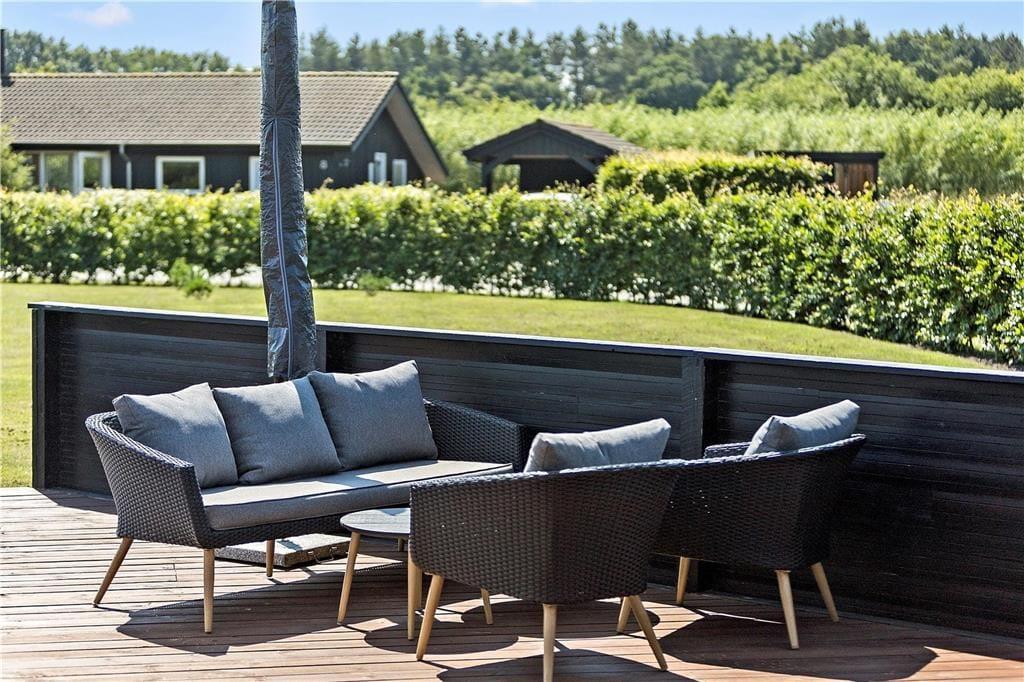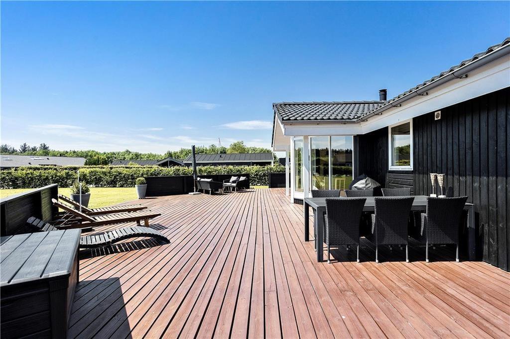 Her har du et flot, lyst og godt sommerhus med enorme overdækkede og åbne terrasser nær ved feriebyen Øster Hurup.