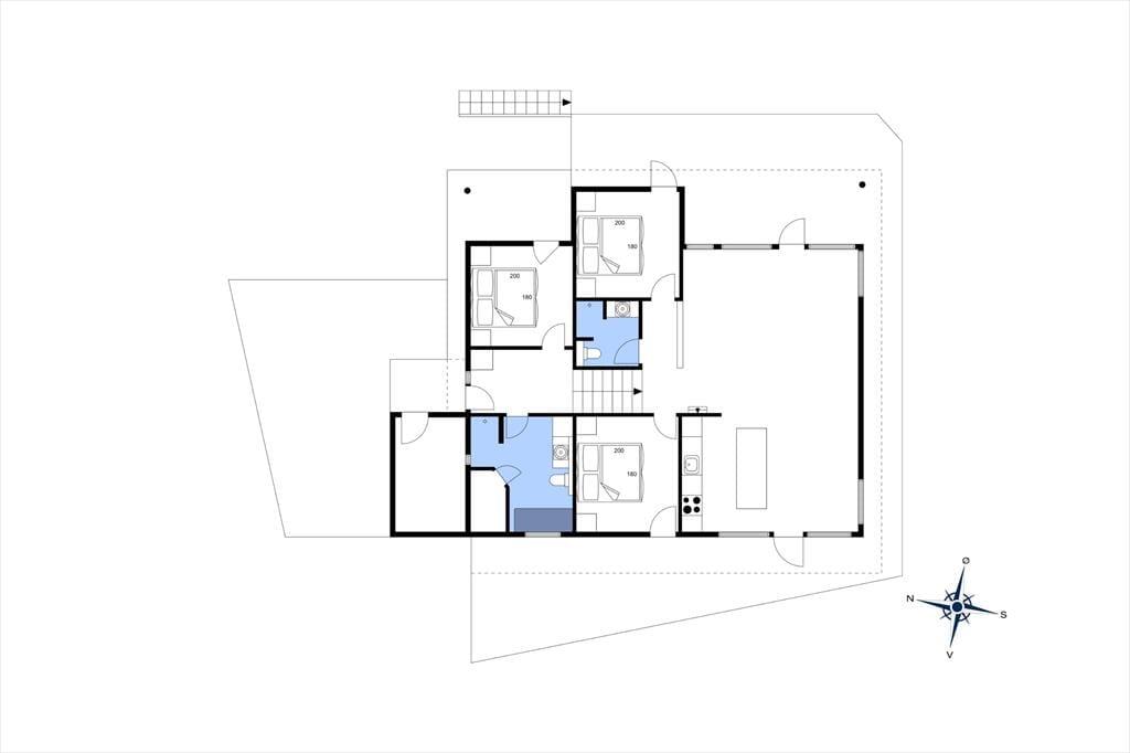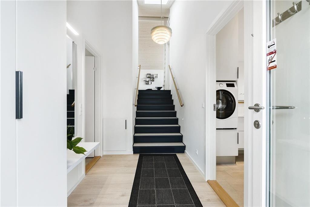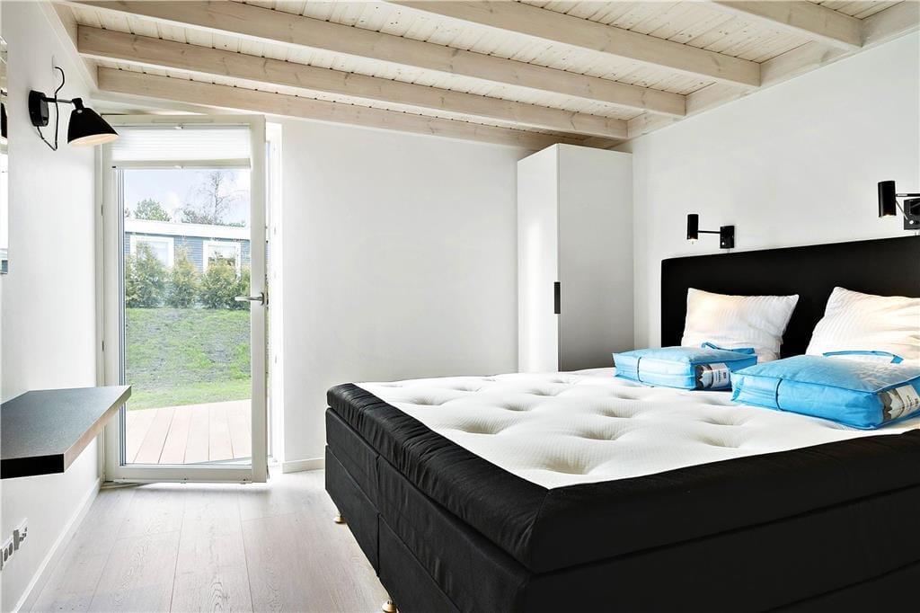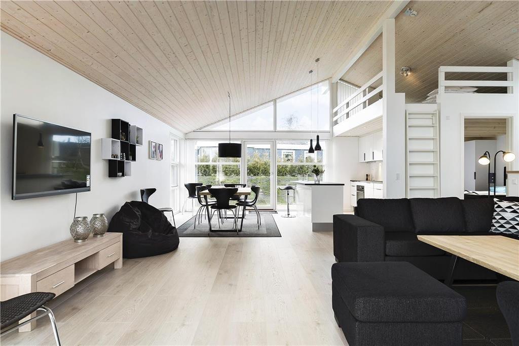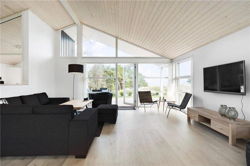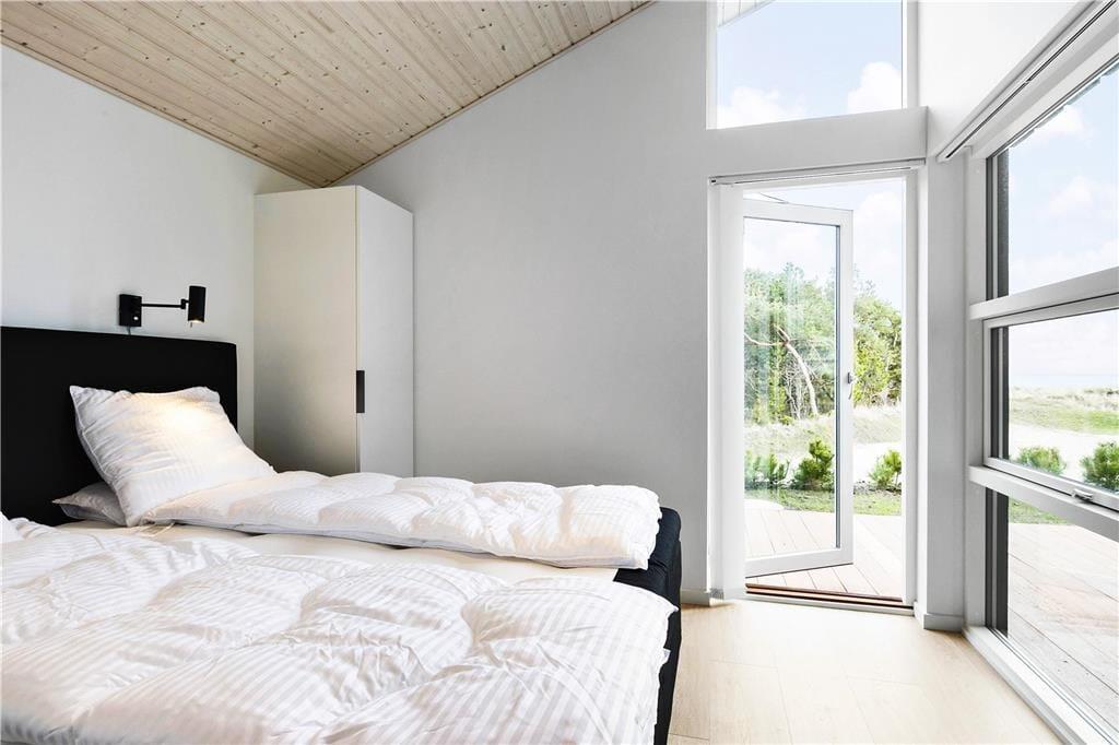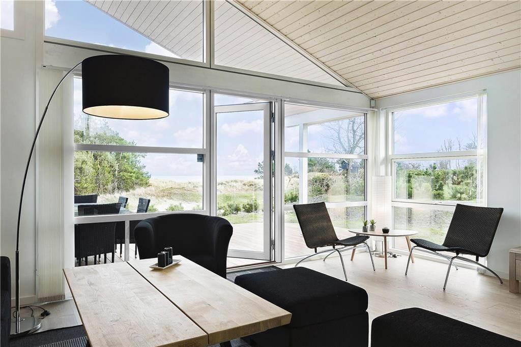 Huset, som er opført så sent som i 2018, er et velproportioneret byggeri på 118 m2 fordelt på to forskudte niveauer, derudover er der helt i top en hems, der fungerer som en ekstra hyggekrog. Overalt er indretningen smagfuld med enkle møbler, der giver en flot, mørk kontrast til de ellers douce farvetoner. Loftet, der går helt til kip, understreger den lyse og luftige atmosfære, og de store glaspartier åbenbarer den flotte udsigt til hav, himmel og natur. Huset byder på mange lækre detaljer: For eksempel er alle tre soveværelser udstyret med store dobbeltsenge med gode boksmadrasser, og i stuen står der et Smart-TV. Køkkenafdelingen, som er integreret med stuen, er veludstyret og dermed en ren fryd at kokkerere i. På det ene af de to badeværelser er der både sauna og spabad, så I kan forkæle jer selv med en afslappende wellness-aften.