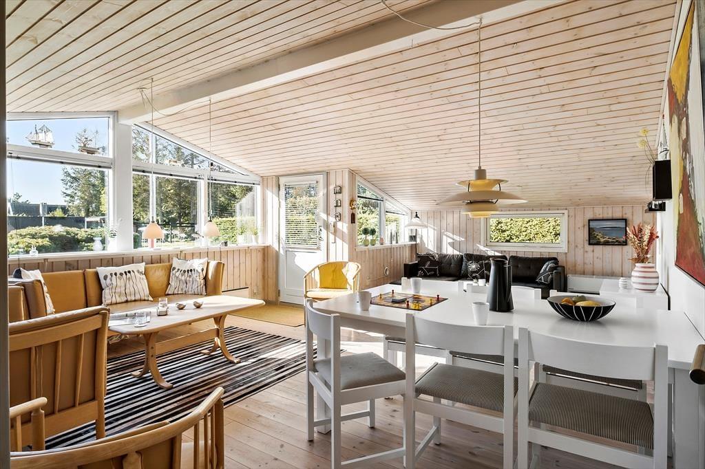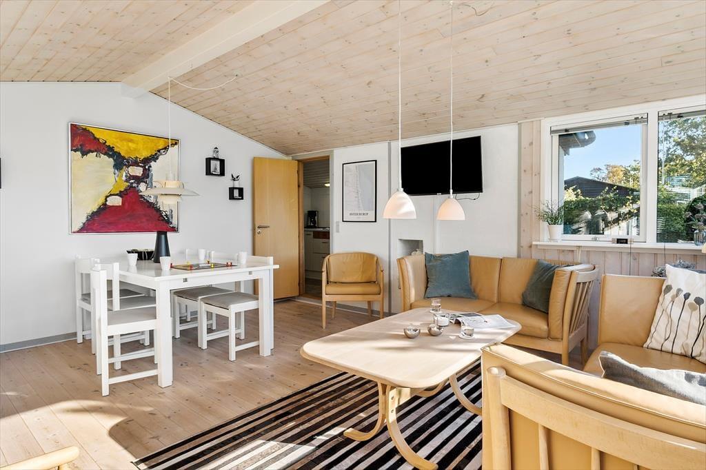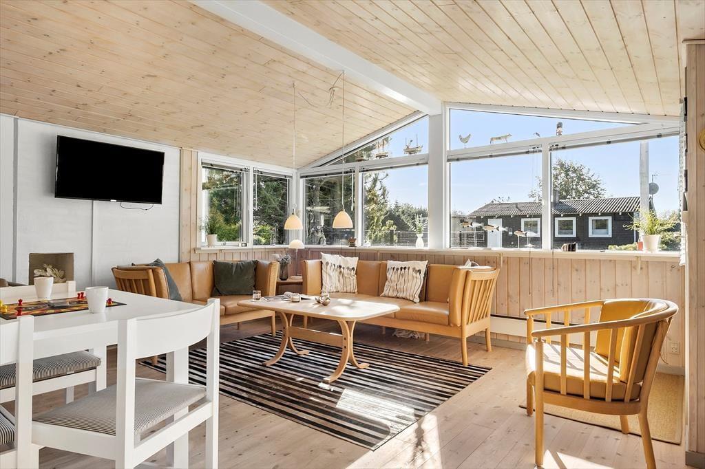 Når du træder indenfor i sommerhuset, møder du en lys og indbydende stue, som indbyder til fælles hygge og samvær. Indretningen er både enkel og komfortabel med gode siddepladser og varme farver, som skaber en afslappet stemning. Her kan I samle jer om brætspil, der står klar i huset, og bruge timer på sjov og konkurrencer i familiens skød. Og når du har lyst til at slappe af i en god bog eller en spændende film, er sofahjørnet det perfekte sted at synke ned og bare nyde feriefreden.