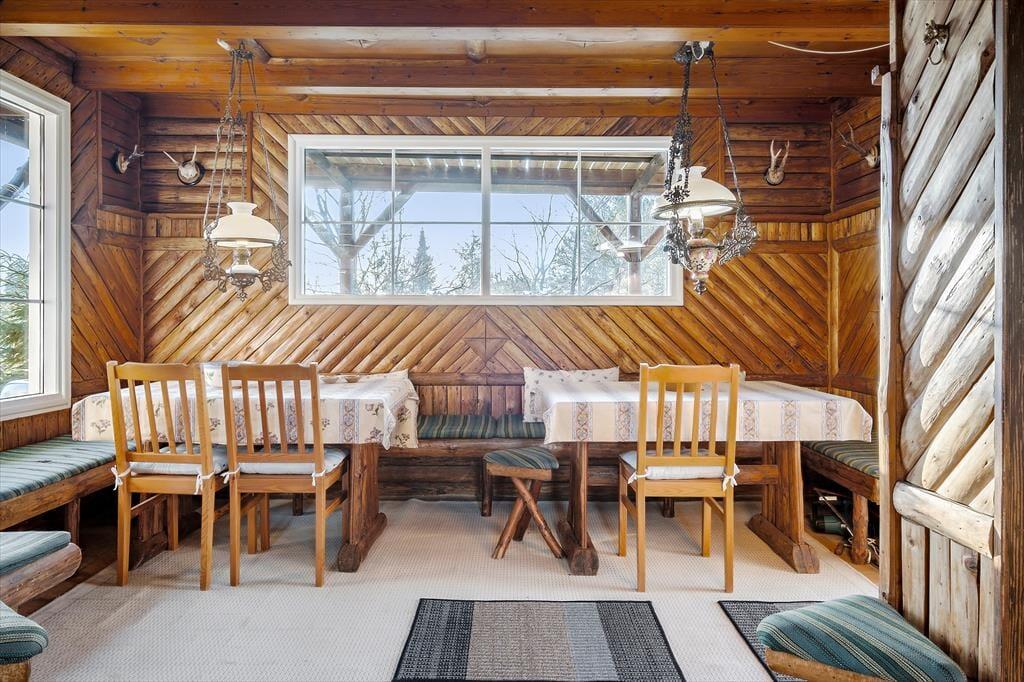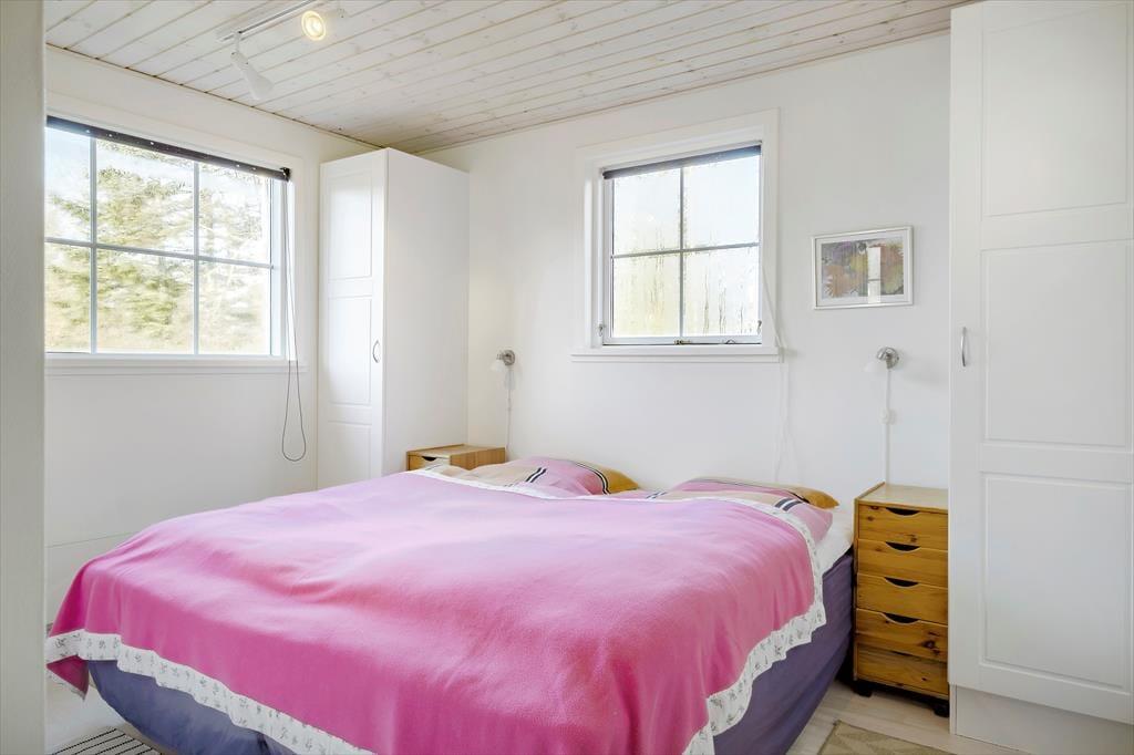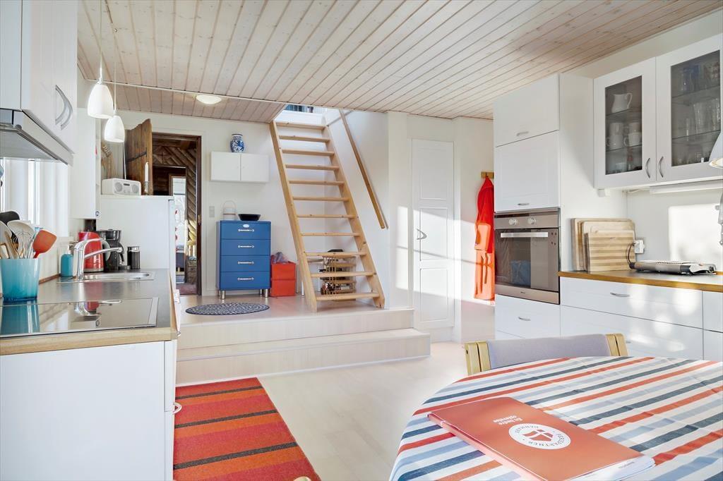 Det 158 m2 store sommerhus knejser på en kuperet naturgrund, og det hæver sig i to indbydende etager. Øverst ligger en skøn udsigtsstue, hvor I kan slappe af nær brændeovnen med en spændende bog eller en film på fladskærms-tv’et. I stueplan har I også god plads til afslapning og socialt samvær i køkken-alrummet og den tilstødende spisestue. Begge rum er indbydende, men har en vidt forskellig atmosfære, for mens køkken-alrummet er lyst og moderne indrettet, har spisestuen træbeklædte vægge og møblement, der minder om, at husets historie går helt tilbage til 1926. Stueplan består for øvrigt af et pænt badeværelse og tre gode soveværelser, så huset egner sig godt til seks personer.