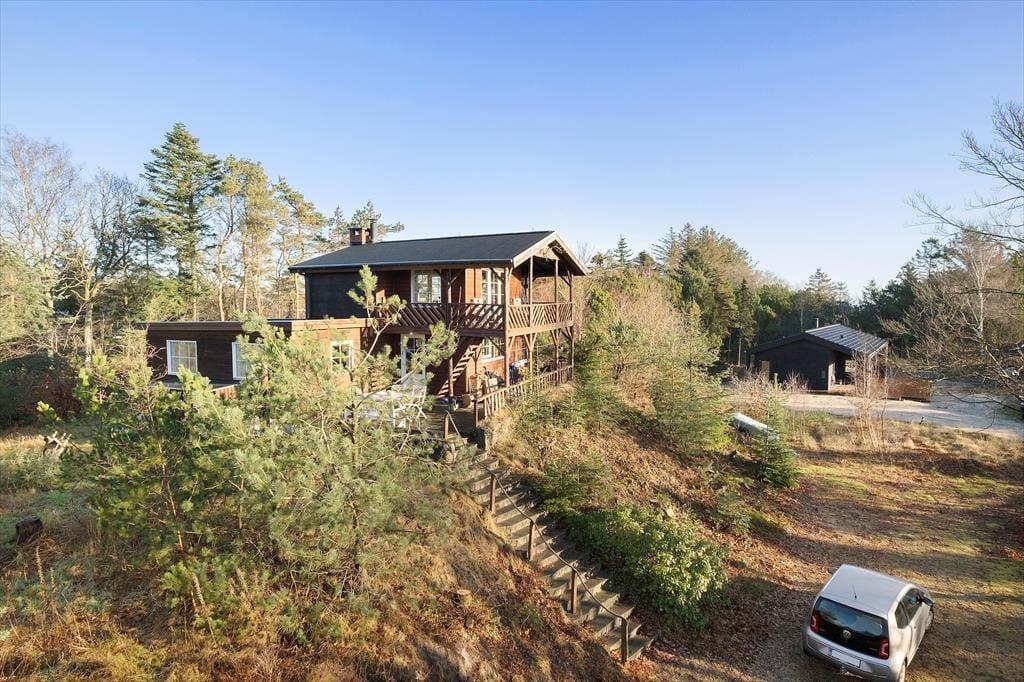 Den skovklædte naturgrund ligger så tæt på stranden, at det kun tager et kort øjeblik at gå fra hoveddøren og ned til vandkanten. Vil I starte dagen med en morgendukkert, skal I bare beslutte, om I vil tage kaffen med ned på stranden eller vente med at indtage den, indtil I er tilbage på terrassen – og hvis I er stået tidligt nok op, kan badeturen endda foregå, mens solen stiger op over Kattegat. Fra den tilbagetrukne adresse har I nem adgang til Øster Hurups bymidte, når I vil købe ind eller ud at spise, og I kan også sætte kursen mod byens hyggelige havn, der ligger cirka halvanden kilometer mod nord.