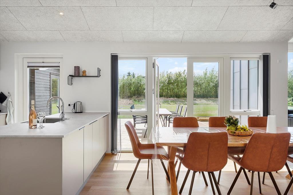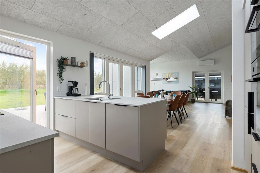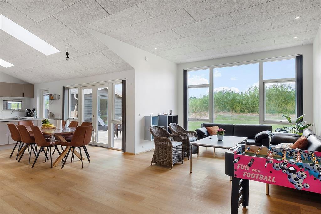 Når du træder ind i det nybyggede sommerhus fra 2024, vil du straks blive mødt af en lys og moderne indretning, hvor alt emmer af komfort og afslapning. Hjertet i huset er det store opholdsrum, hvor køkken, spiseplads og stue går op i en højere enhed – perfekt til samvær og hyggelige middage. Her kan du slår dig ned i sofaen med en god bog eller tager en afslappet runde bordfodbold med børnene. Både små og store vil elske denne sjove aktivitet, hvor konkurrencegenet kan få frit løb. Efter en aktiv dag kan du forkæle dig selv i det lækre badeværelse med direkte udgang til et privat udendørs spabad og udebruser – her er wellness på et helt nyt niveau.