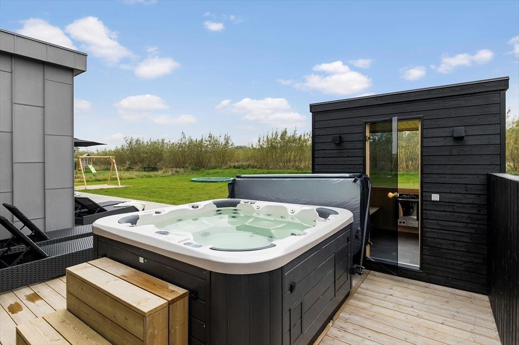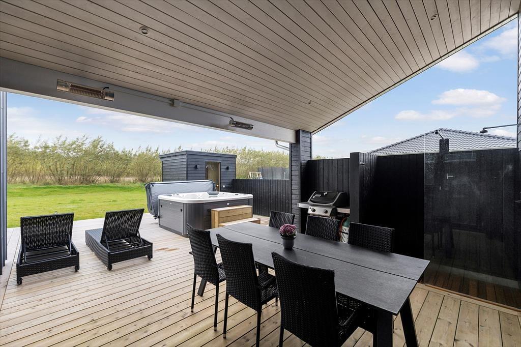 Den store, indbydende terrasse er en oplagt base for at nyde feriens stille stunder i solens varme. Terrassen er udstyret med gode havemøbler og har plads til både afslapning og lækre måltider i det fri. Måske starter du dagen med morgenkaffen i hånden, mens duggen forsvinder fra græsplænen, eller også samles hele familien til en god middag, hvor duften af grillen spreder sig i luften. Hvis du trænger til lidt ekstra afslapning, kan du dyppe dig i det opvarmede spabad, mens du kigger ud over haven. Og har du elbil, kan du nemt lade den op her, så du er klar til de næste udflugter.