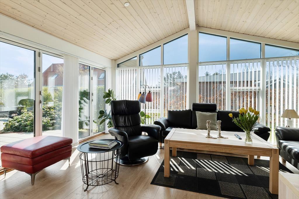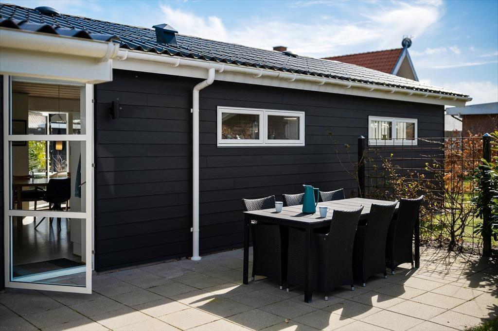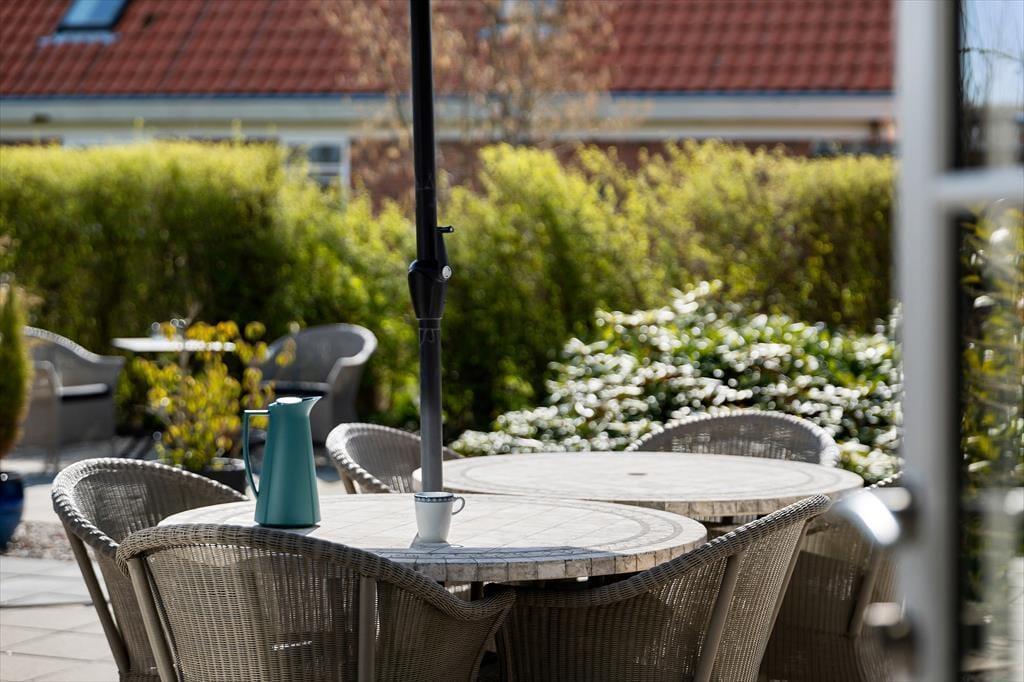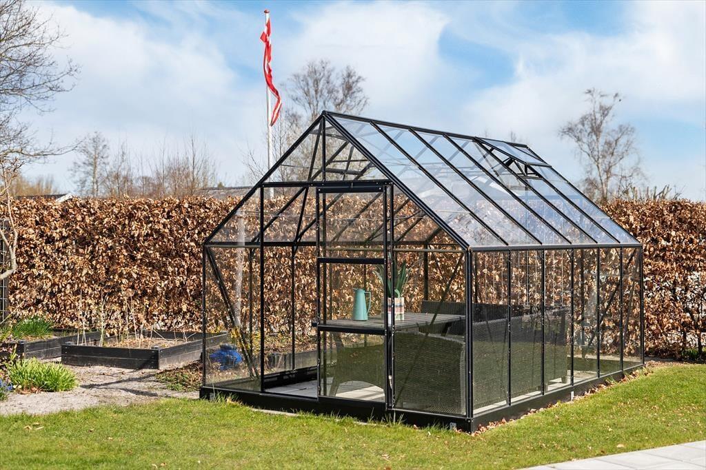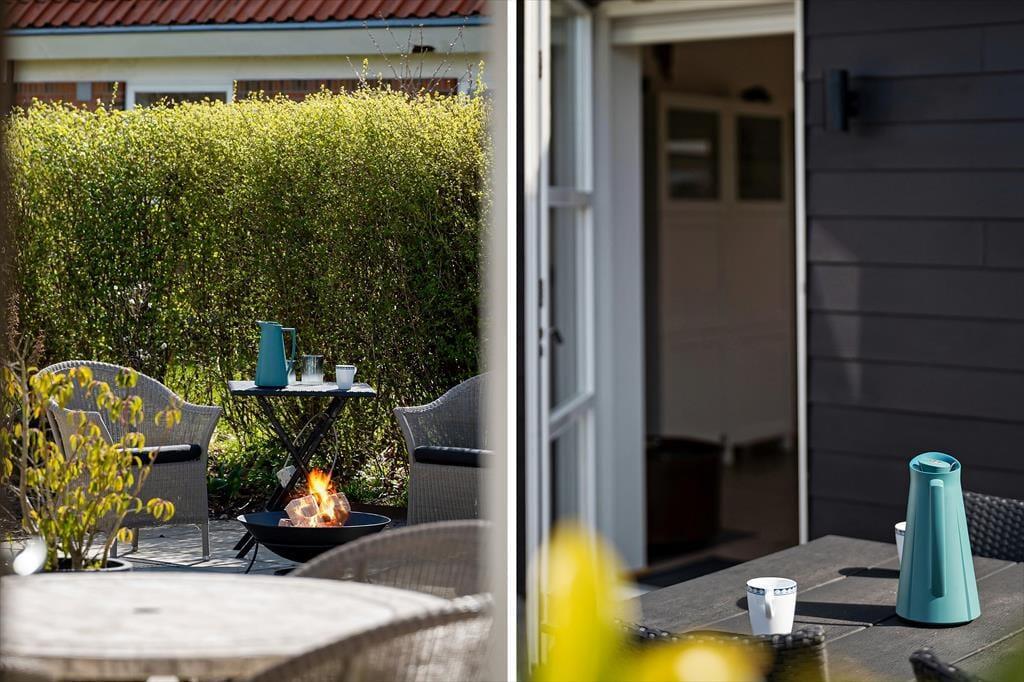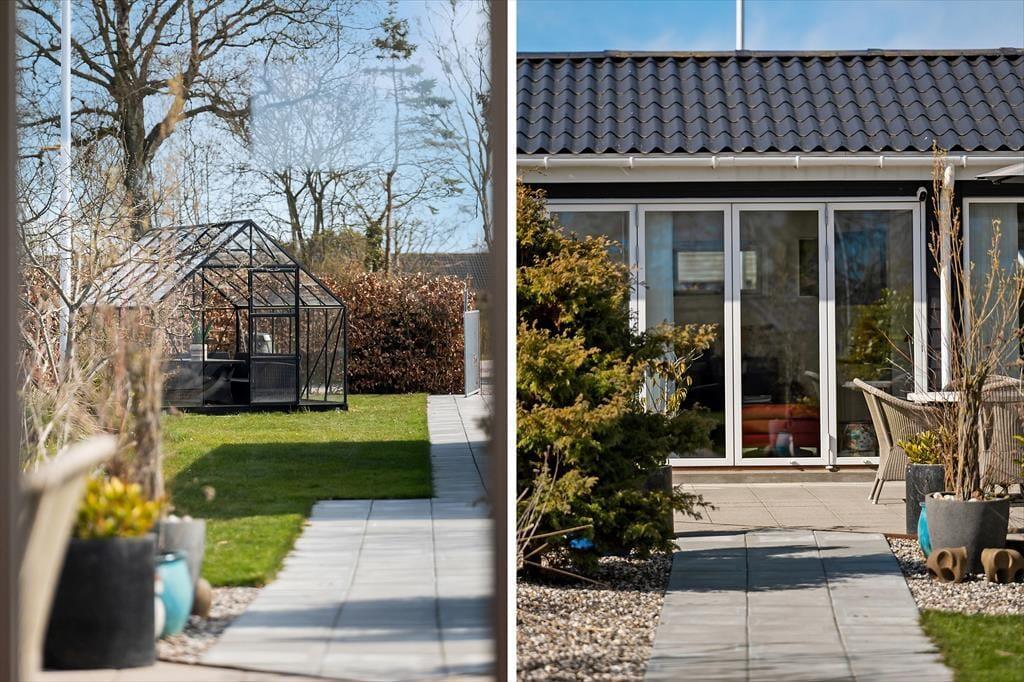 Udenfor fortsætter feriestemningen i fuldt flor. Sommerhuset ligger omgivet af grønne omgivelser og flere lækre terrassemiljøer, så du altid kan finde et sted i læ for vinden eller i solen alt efter dagens humør. Start dagen med morgenkaffen på den østvendte terrasse, nyd en lang frokost i drivhuset, mens du kigger ud på haven, og afslut med aftensmad og aftenstemning i solens sidste stråler. Drivhuset er møbleret og fungerer som et ekstra opholdsrum, hvor du kan nyde udelivet selv på de mere kølige dage. Her kan du for eksempel nyde en god bog i varmen, spille brætspil med børnene eller bare sidde og lytte til regnen, der trommer sagte på taget. De hyggelige uderum indbyder til leg, afslapning og fælles måltider under åben himmel – og på varme sommeraftener kan du tænde grillen og lade duften af stegte grøntsager og saftige bøffer brede sig over haven.