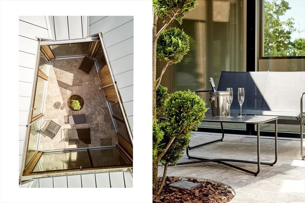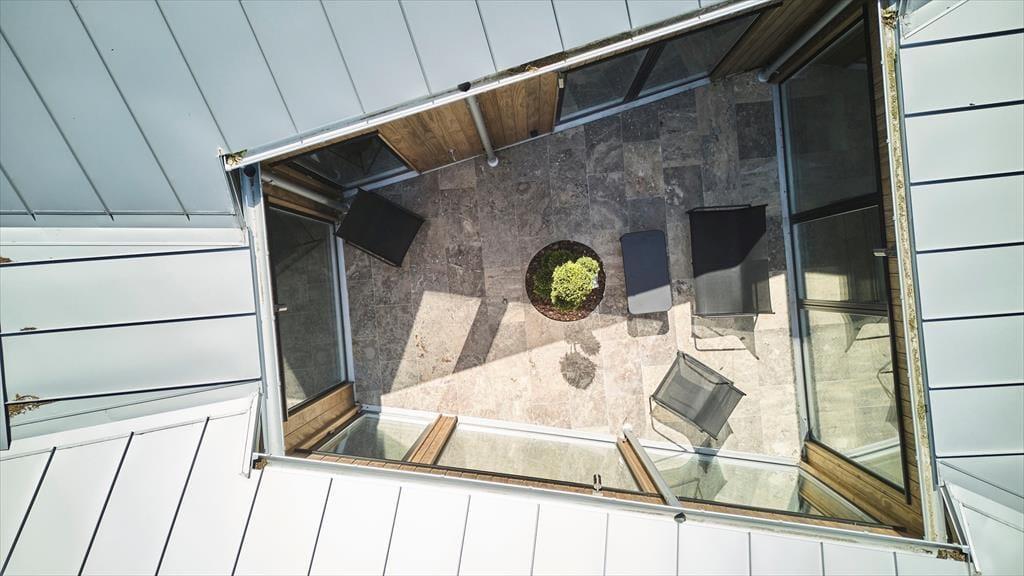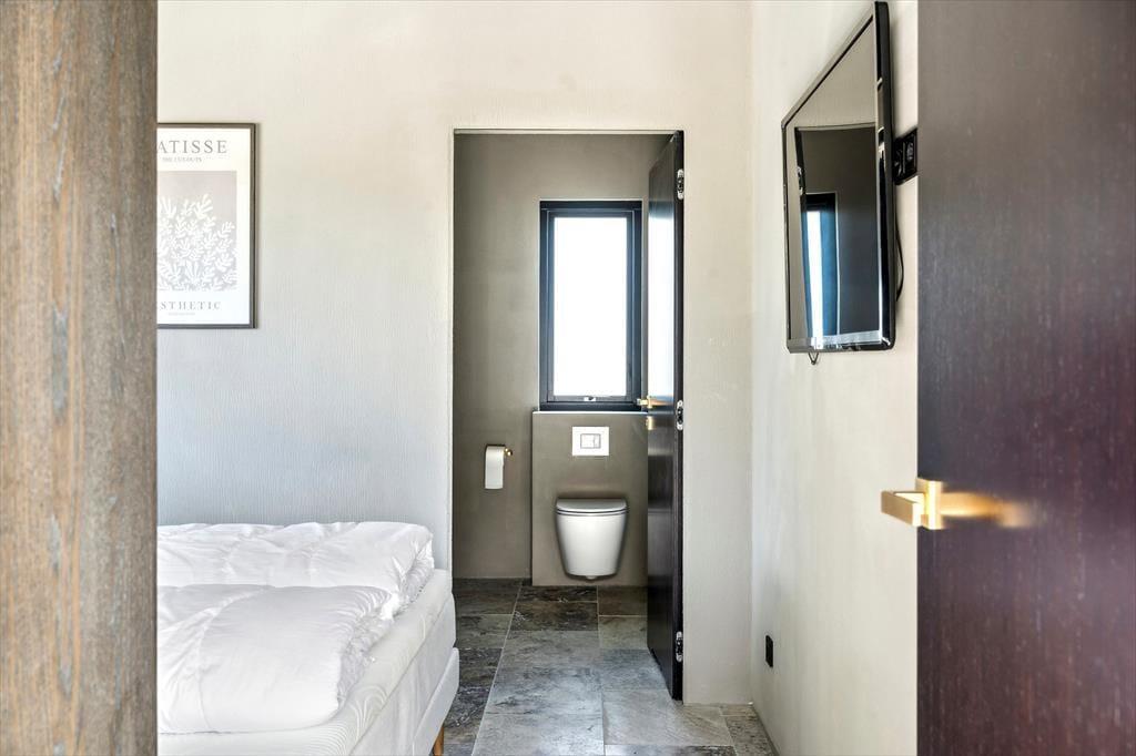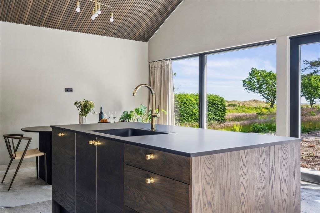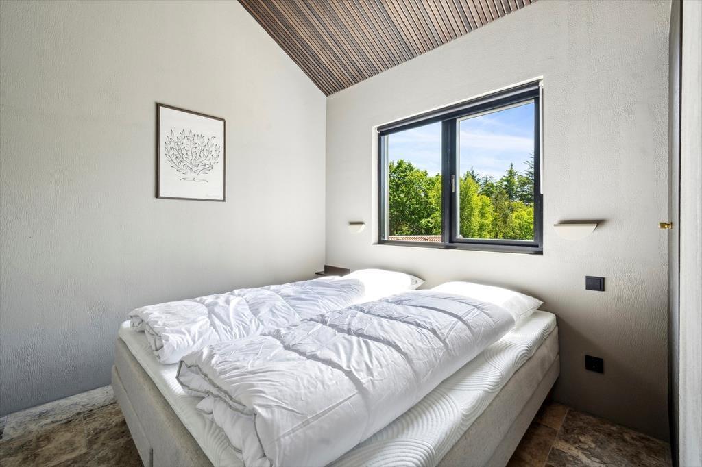 Der er kælet for detaljerne i dette nybyggede sommerhus, og det mærkes med det samme, man træder indenfor. De høje lofter og de store vinduespartier skaber en luftig og åben fornemmelse, hvor dagslyset strømmer ind og får rummene til at emme af fred og varme. Indretningen er stilren og moderne, men uden at miste sommerhusets helt særlige hygge – og her er skabt plads til både afslapning og samvær. Den åbne opholdsstue smelter sammen med køkkenet og bliver samlingspunktet for familiens hyggestunder, hvad enten det er til brætspil, madlavning eller en god film. Midt i huset finder du en lille, charmerende gårdhave, som giver ekstra lys og en helt særlig stemning til indendørslivet. Her kan du nyde en stille stund med en kop kaffe, mens solen spiller på væggene og stilheden sænker sig.
