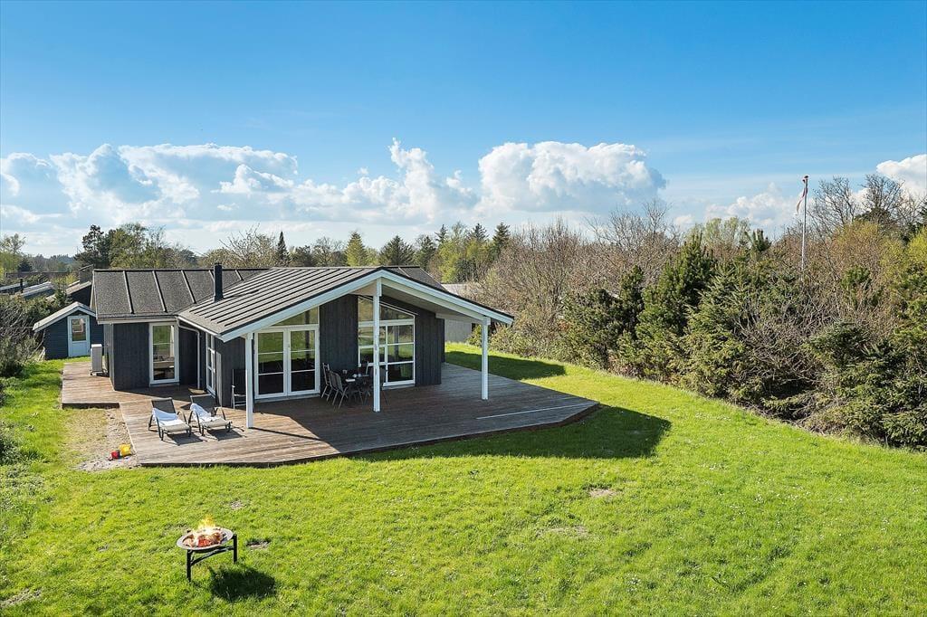 Når solen skinner over Øster Hurup – og det gør den ofte – bliver udelivet en stor del af ferieoplevelsen. Sommerhuset byder på flere skønne terrasser, hvoraf en er delvis overdækkede, så du kan vælge opholdsplads efter både vejr og stemning. Måske har du lyst til at starte dagen med en stille stund og en varm kop te i morgensolen, eller måske vil du samle hele familien til en grillaften i aftenskæret, mens børnene leger på plænen. Den storslåede havudsigt følger dig næsten overalt, og når vinden er mild, kan du høre Kattegats bølger rulle blidt mod kysten. I tørvejr og læ kan du læne dig tilbage i liggestolen og mærke ferieroen brede sig, mens du nyder duften af saltvand og sommer. Terrasserne er placeret, så du altid kan finde et solrigt hjørne eller skygge, hvis det er dét, du trænger til.