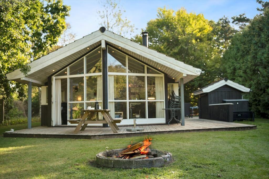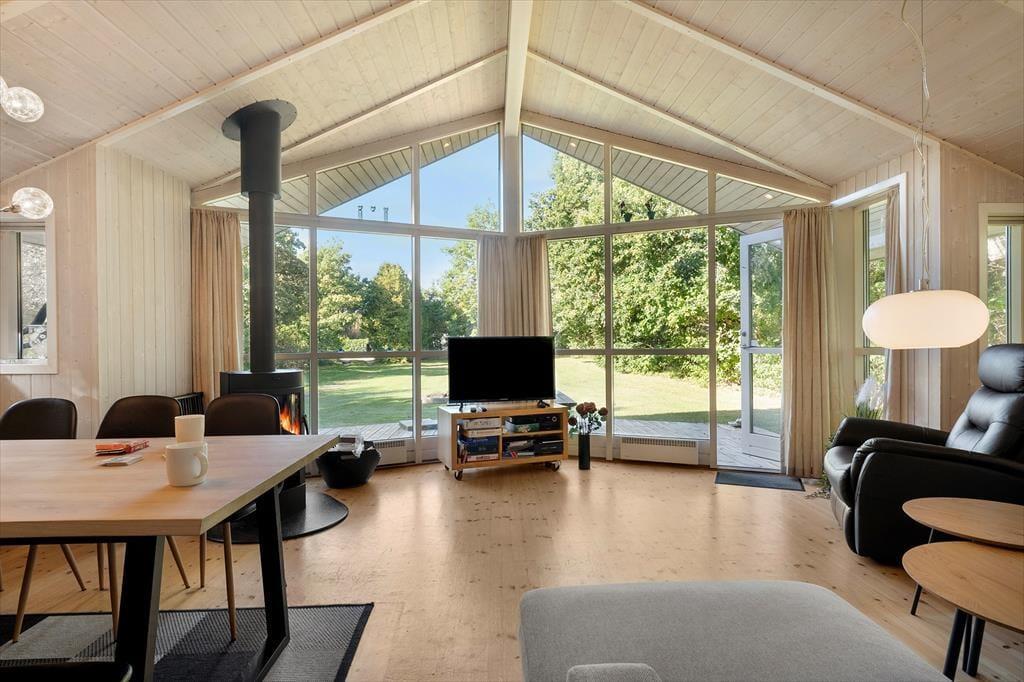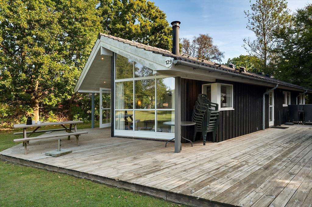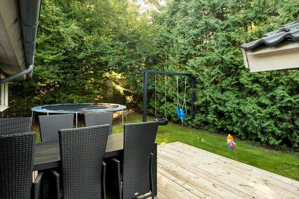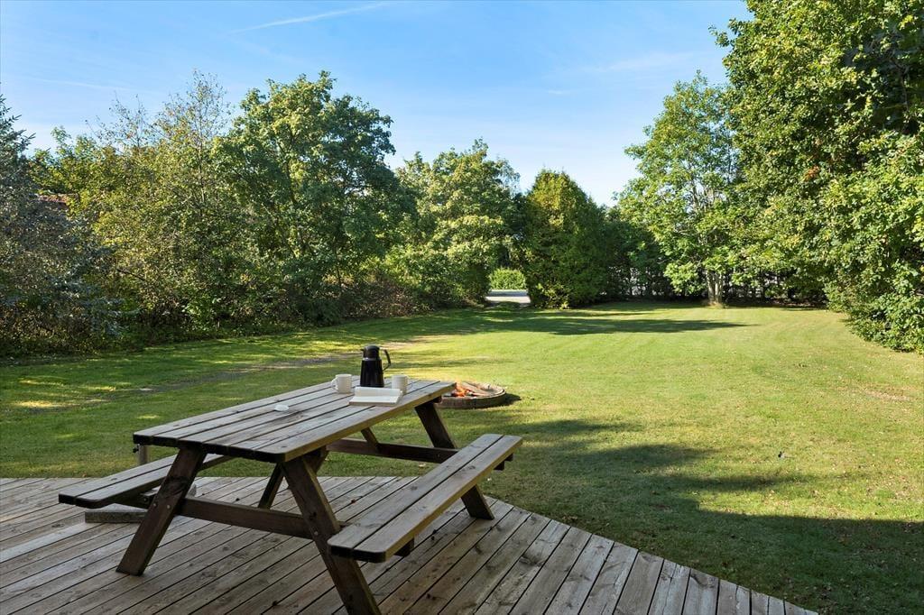 Sommerhuset ligger på en dejlig grund med en stor, solrig træterrasse, der indbyder til mange timer i det fri. Her kan du nyde morgenkaffen, mens solen står op over trætoppene, eller finde et skyggefuldt hjørne med en god bog. Haven giver masser af plads til både leg og afslapning – og hunden er selvfølgelig også velkommen til at løbe frit rundt, for her er der tænkt på hele familien. Når aftensmaden skal tilberedes, kan grillen tændes, mens børnene leger på græsset, og dagen rundes af med hyggesnak under åben himmel, mens duften af sommer hænger i luften.