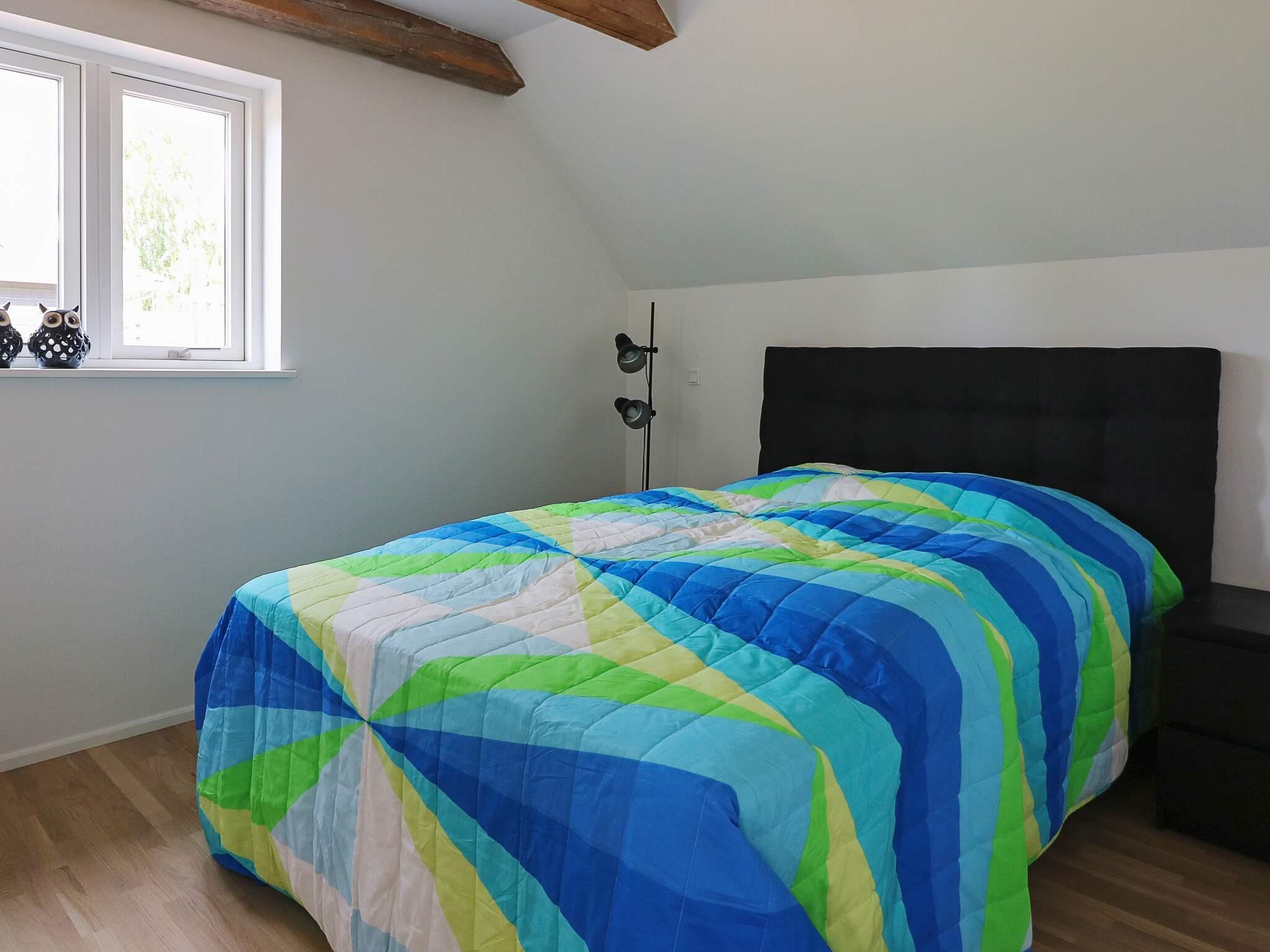 Entré med trappe til 1. sal, hvor der er to store soveværelser med dobbeltseng og en lille opholdsstue. Sommerhuset ligger på en stor grund med græsplæne med plads til boldspil og leg. Udlejes ikke til ungdomsgrupper.