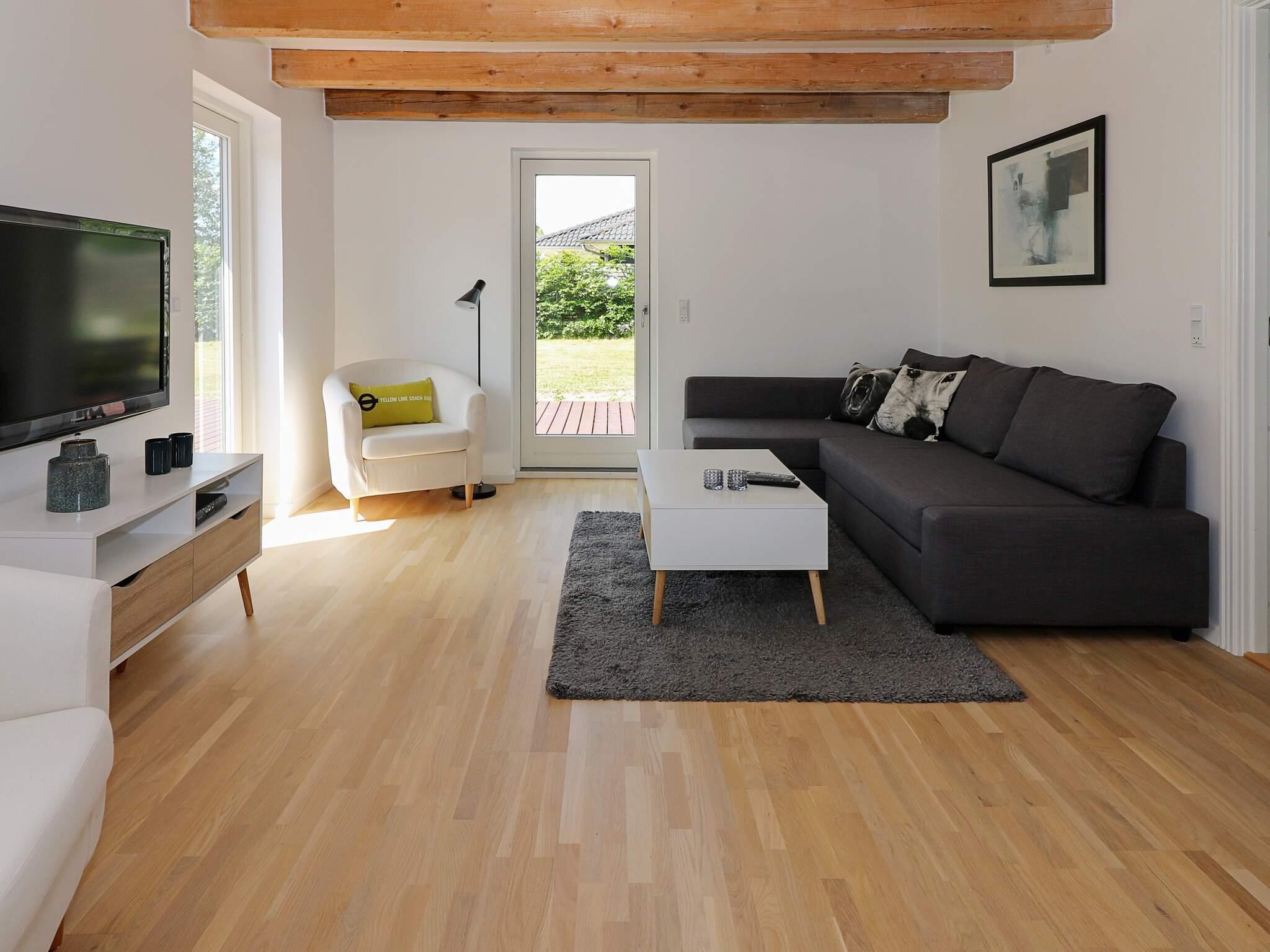Lys og rummelig stue i forbindelse med køkken og spiseafdeling og med udgang til en stor træterrasse. Bryggers med vaskemaskine, badeværelse med bruser og toilet samt soveværelse med dobbeltseng.