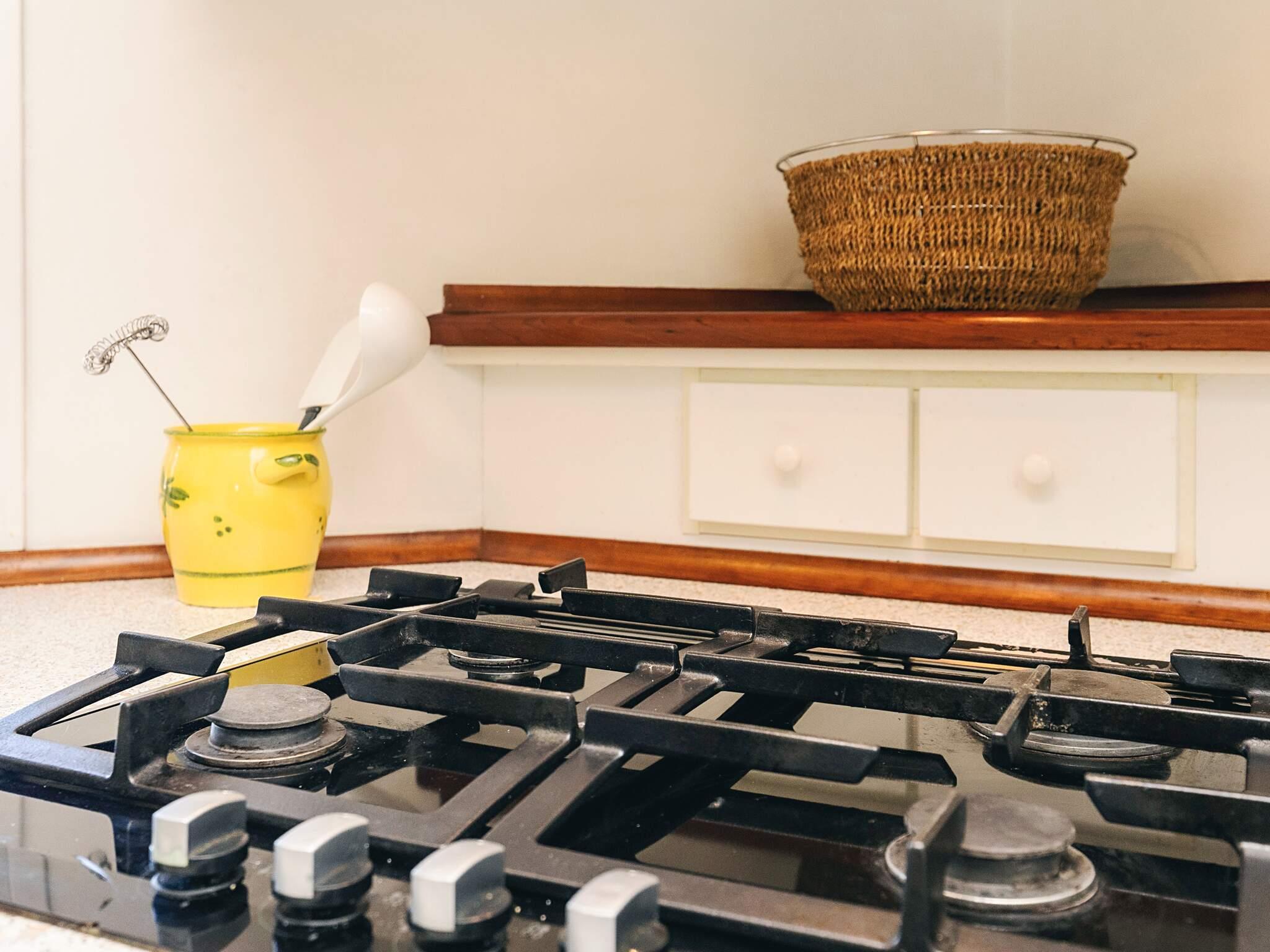 Køkken: Gaskomfur, ovn, køleskab m/frostboks, mikroovn, kaffemaskine, opvaskemask.