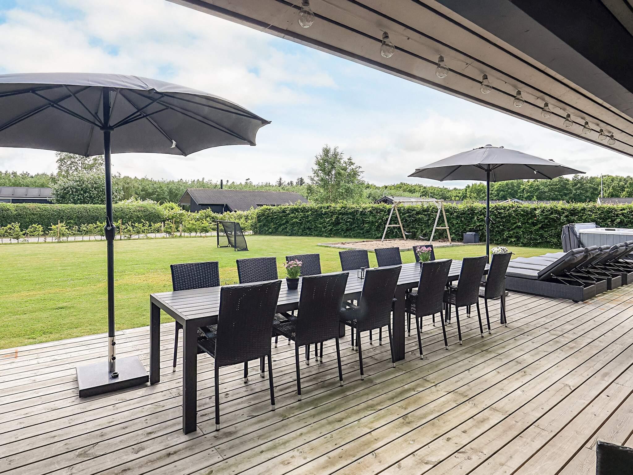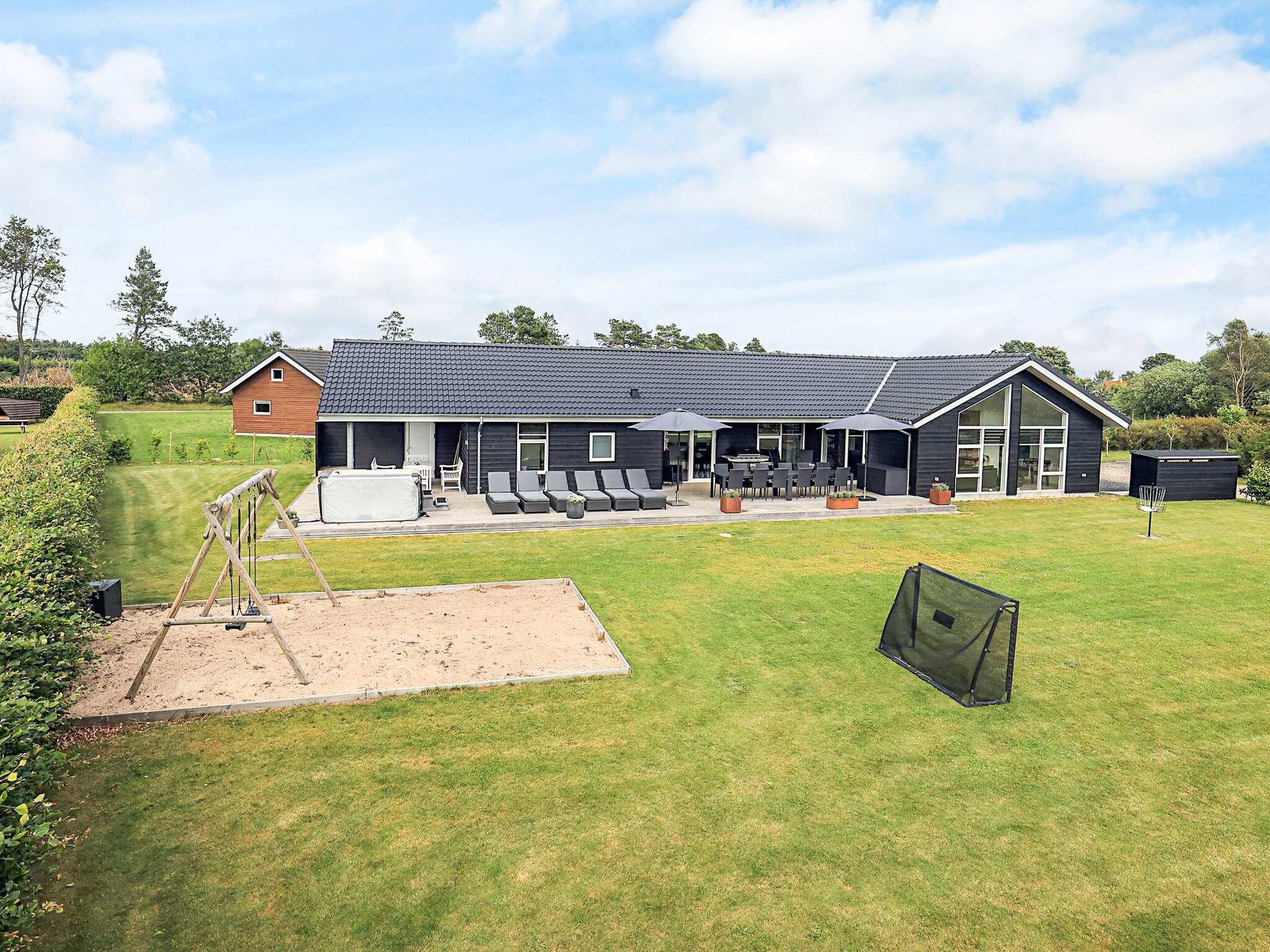 Flot sommerhus i Øster Hurup med stor terrasse, udendørs spa og aktivitetsrum nær børnevenlig sandstrand.