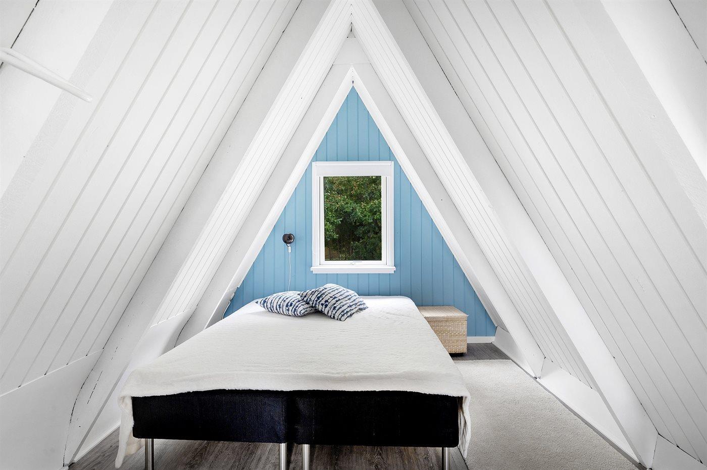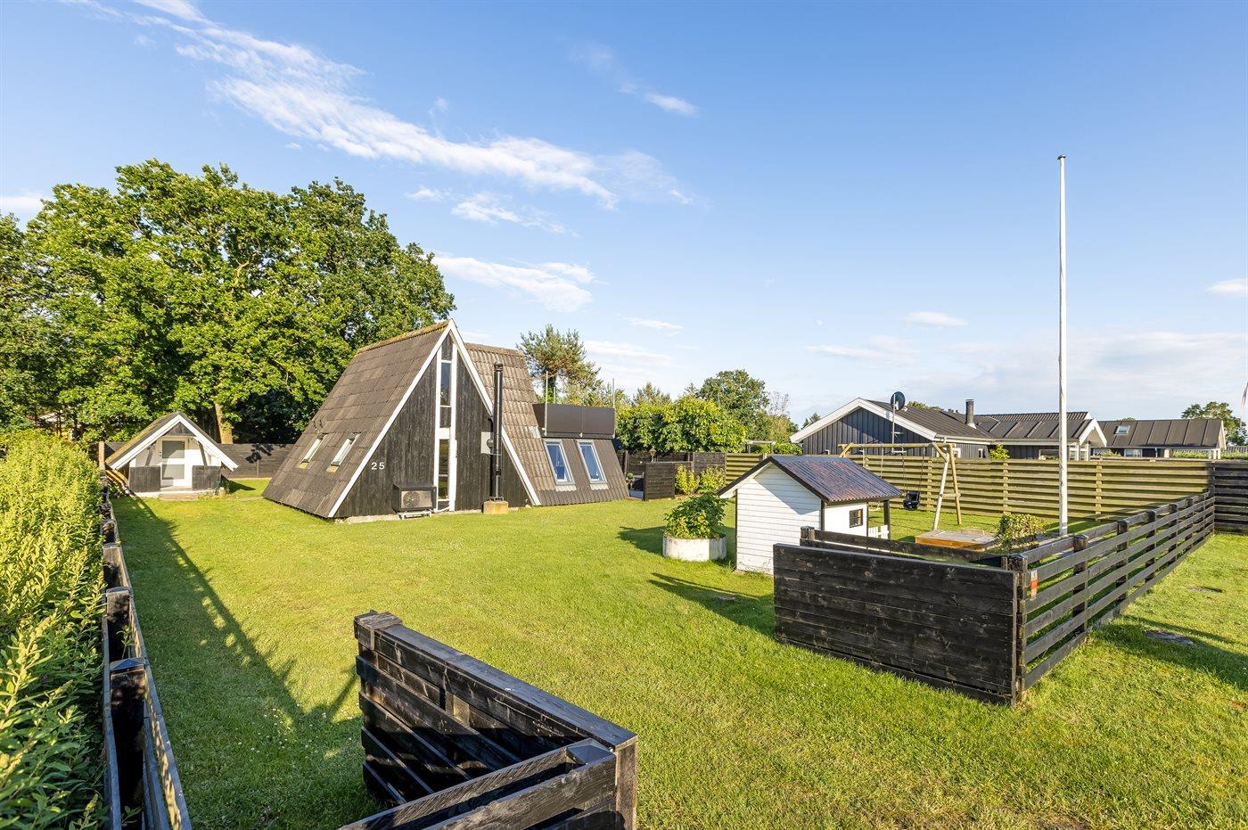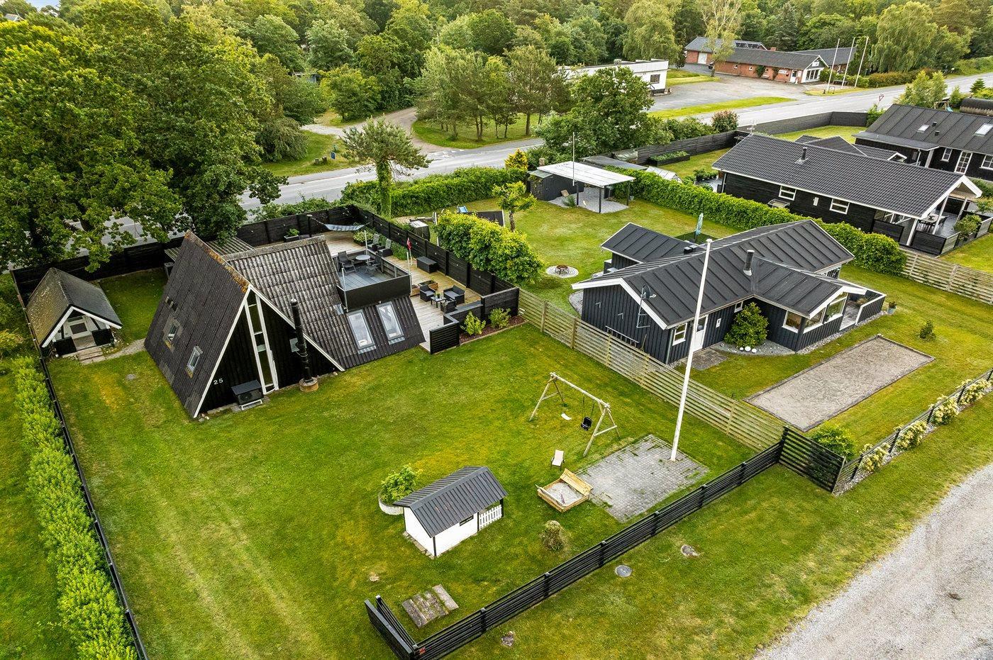 I dette specielle A-sommerhus er der skabt en hyggelig atmosfære, med hyggekroge både inde og ude. Indenfor kan der hygges med spil i den åbne planløsning, mens man nyder varmen fra brændeovnen. Ude kan man grille mens de små leger i legehuset, på gyngestativet eller i sandkassen.