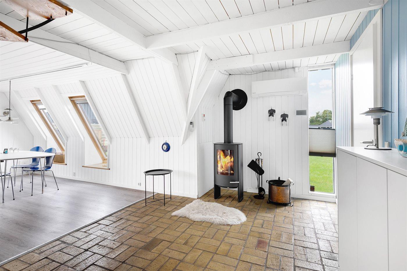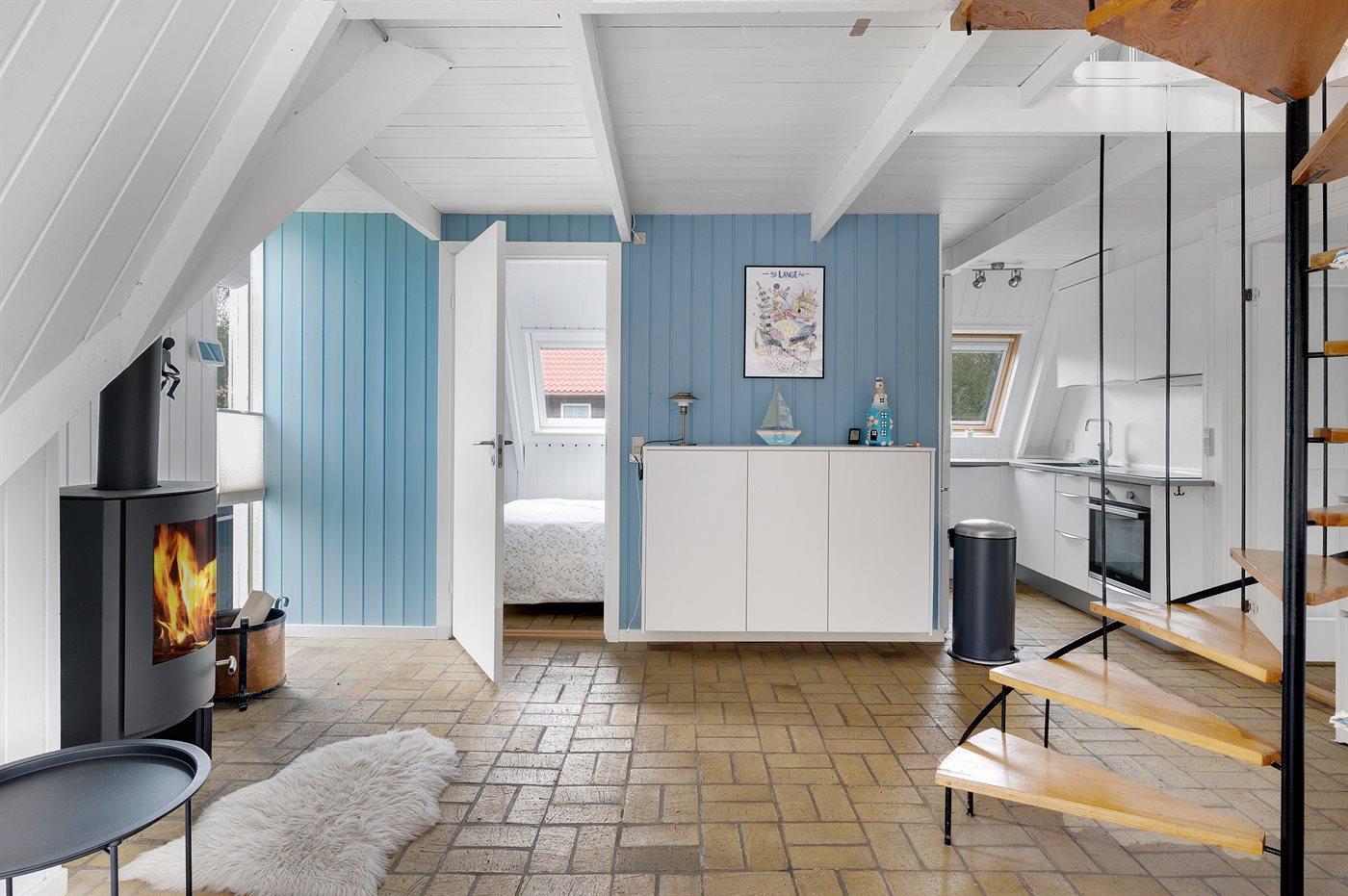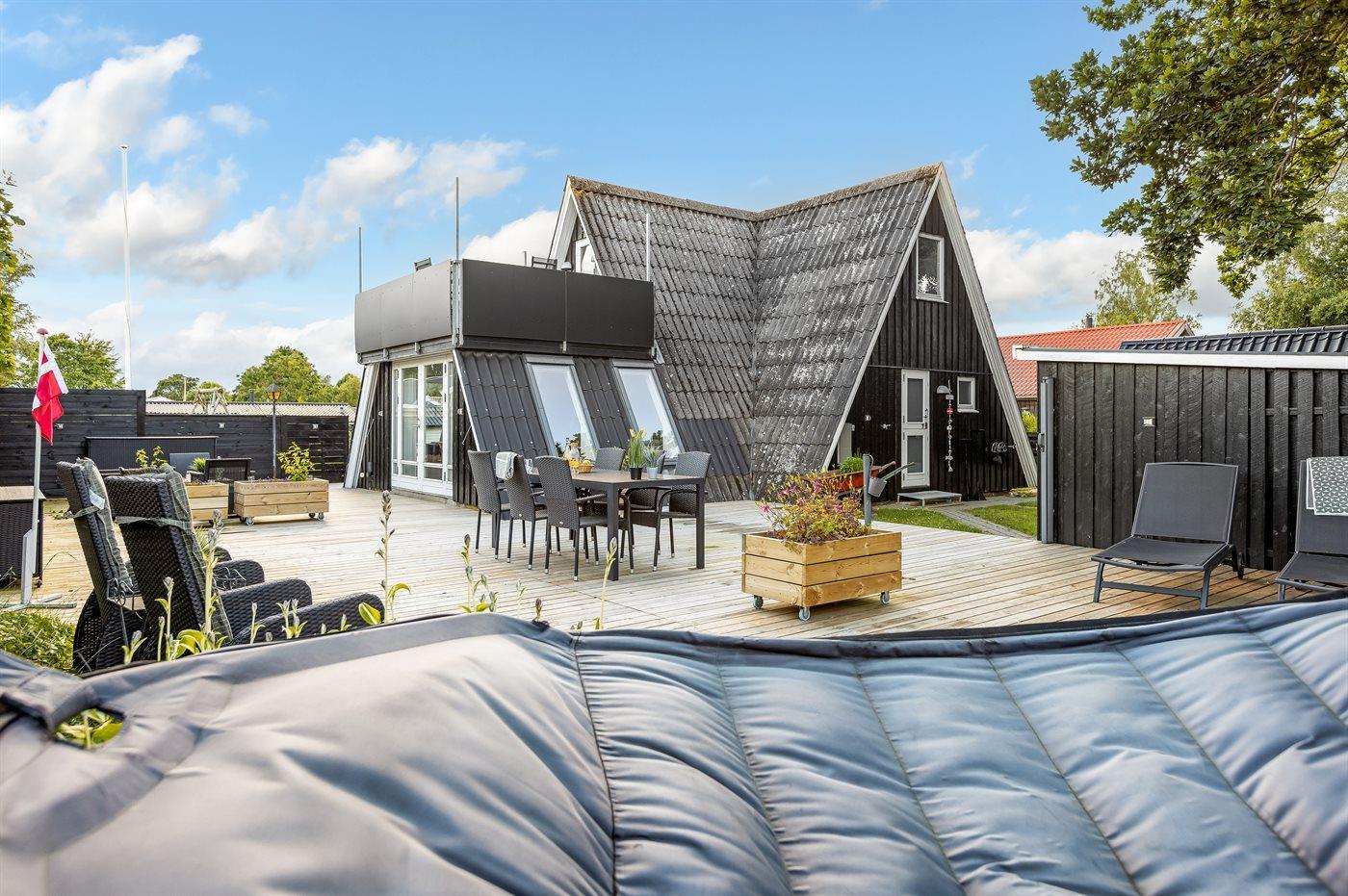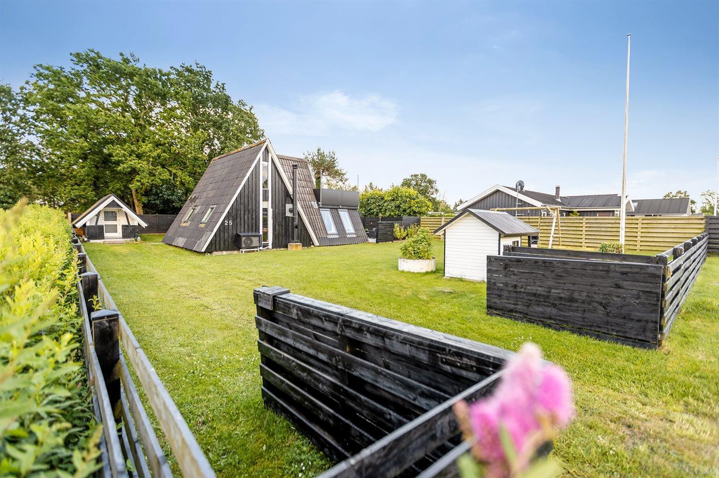 I dette specielle A-sommerhus er der skabt en hyggelig atmosfære, med hyggekroge både inde og ude. Indenfor kan der hygges med spil i den åbne planløsning, mens man nyder varmen fra brændeovnen. Ude kan man grille mens de små leger i legehuset, på gyngestativet eller i sandkassen.