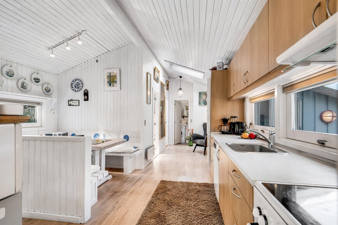 Køkkenet er udstyret med 1 køleskab. Der er 4 keramiske kogeplader, varmluftovn, mikrobølgeovn samt opvaskemaskine.