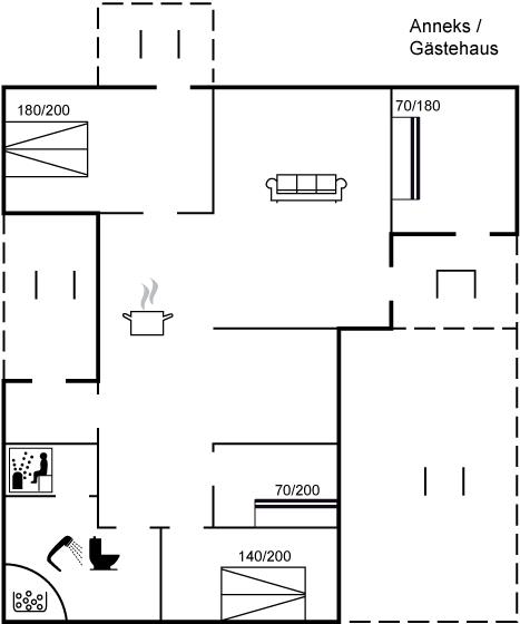 Der er i alt 3 soveværelser. Sovepladserne fordeler sig på: 4 sovepladser i dobbeltsenge. 3 sovepladser i køjesenge. 1 af disse sovepladser befinder sig i anneks. Derudover er der 1 stk. barneseng.