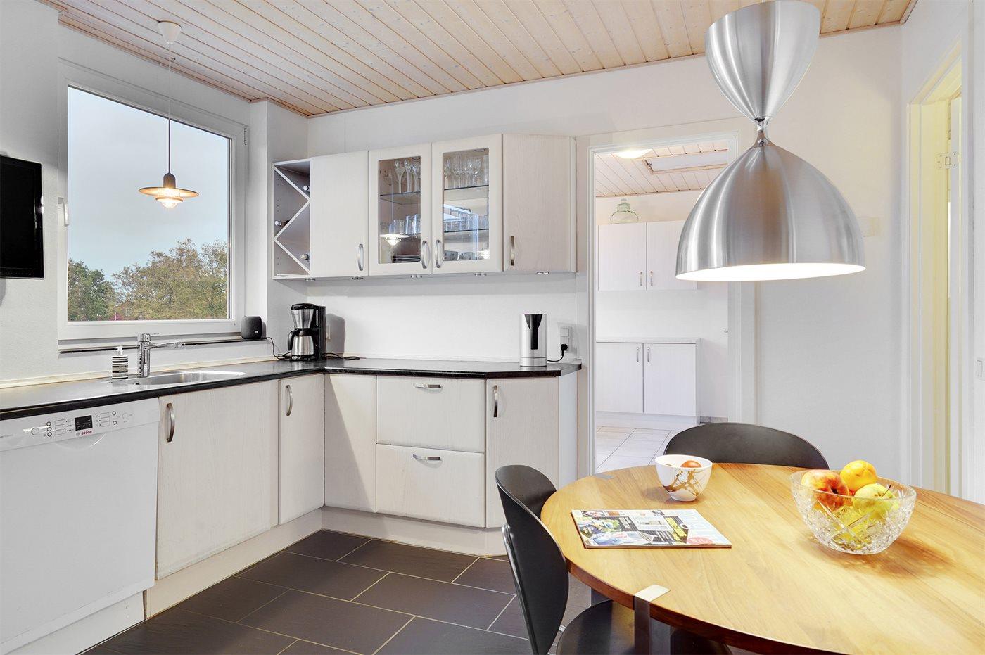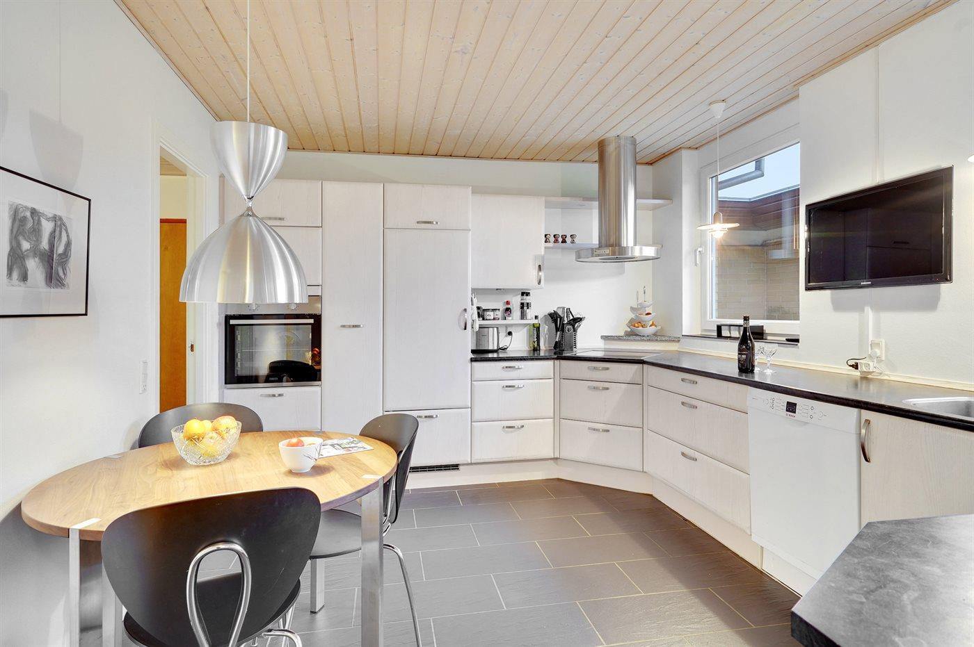 Køkkenet er udstyret med 1 køleskab. Der er 4 keramiske kogeplader, varmluftovn, mikrobølgeovn samt opvaskemaskine Der er gulvvarme i køkkenet.