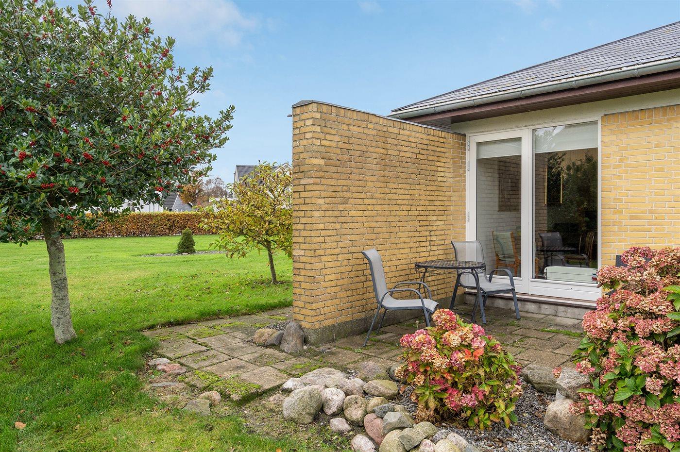 Ferieboligen er beliggende på en 2362 m² stor havegrund. Grunden er indhegnet. Der er 250 m til havet. Nærmeste forretning er beliggende i en afstand af 290 m. Der er en golfbane i en afstand af 19000 m. Til ferieboligen hører 130 m² terrasseareal. Ligeledes er der adgang til udestue. Der ligger en legeplads i en afstand af 600 m. Parkering ved ferieboligen.