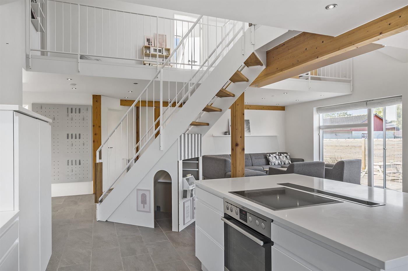 Med dette arkitekttegnede hus på hele 216 m2 får I god plads til at hygge jer inden døre. Og så kommer det endda til at foregå i lyse og lækre rammer, for huset står nemlig særdeles flot efter en totalrenovering i 2020 hvor alt er moderniseret. På førstesalen ligger fire af sommerhusets fem soveværelser, og heroppe finder I også et badeværelse med brus. Et ekstra badeværelse med brus og det femte soveværelse ligger i stueplan, der derudover byder på et bryggers og en stor stue med integreret køkken. Her kan I med andre ord stornyde hinandens selskab, også mens nogen står for aftensmaden og andre spiller brætspil ved spisebordet og slapper af i sofaen - eller leger i den søde, lille butik, der er etableret under trappen til de yngste feriegæster.