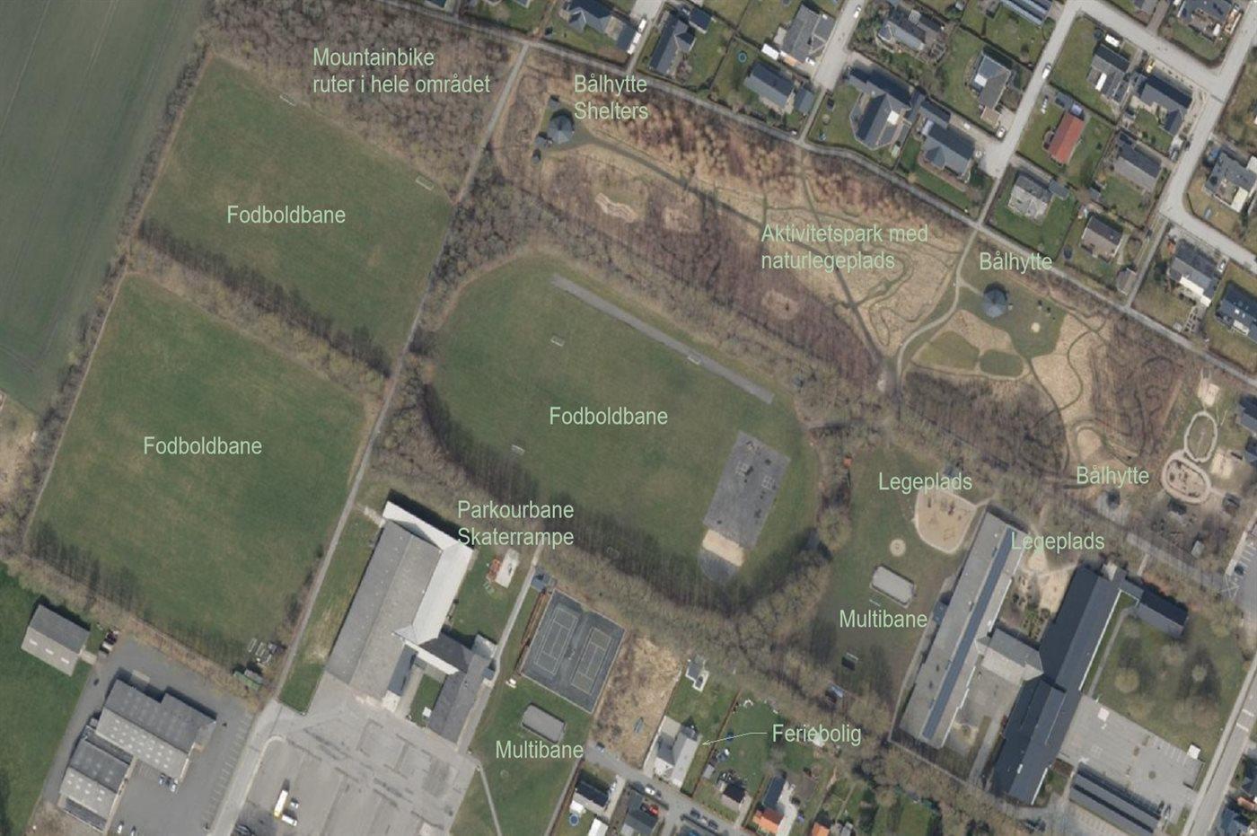 Den 1300 m2 store grund præsenterer sig ligeledes på tjekket vis. Her er god plads til parkering på flisearealet, og rundt om sommerhuset er der flere dejlige og ugenerede solkroge at vælge imellem. I kan også sætte jer på førstesalens store altan, hvor I kan nyde synet af den velordnede have og bæltet af høje træer, der støder op til grunden. På skråningen under de høje træer er der etableret et legetårn og mens børnene leger der, kan man prøve kræfter med den lokale mountainbike rute som ligeledes går på skråningen. I haven er der for øvrigt også taget hensyn til børnene, der kan springe i trampolin, gynge, lege i sandkassen eller legehuset og boltre sig på græsplænen. Hvis man bevæger sig lidt uden for grunden, findes der indenfor 200 meter en skøn aktivitetspark med dertilhørende shelters, bålhytter og natur legeplads, 2 multibaner, fodboldbaner, skaterbane, parkourbane og stor legeplads ved skolen som er offentlig tilgængelig. Der er mulighed for opladning af elbil indenfor 500 meter fra feriehuset.