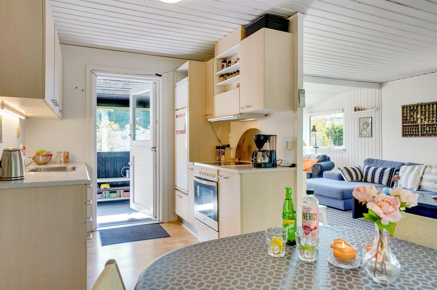 Køkkenet er udstyret med 1 køleskab. Der er 4 keramiske kogeplader, varmluftovn.