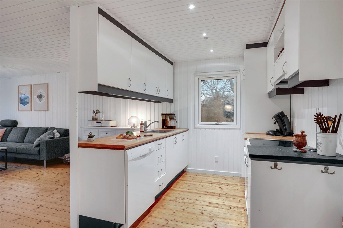 Køkkenet er udstyret med 1 køleskab. Der er 4 keramiske kogeplader, varmluftovn, mikrobølgeovn samt opvaskemaskine.