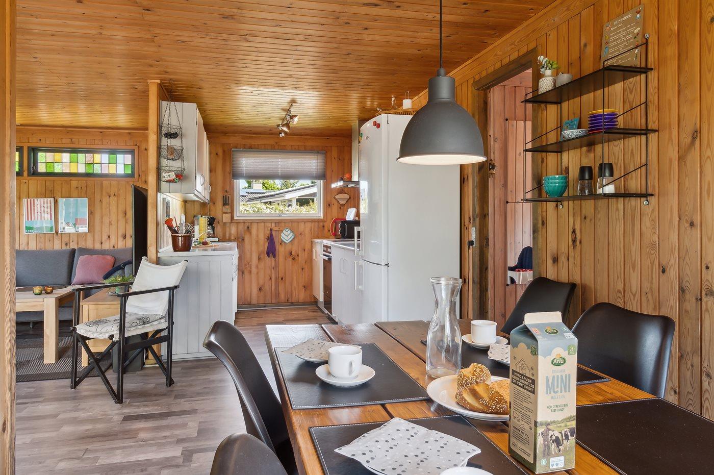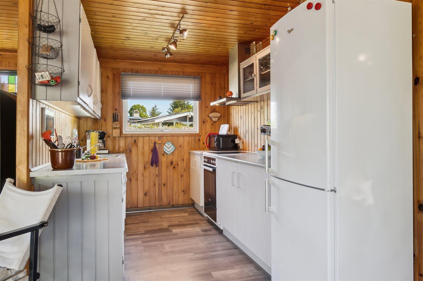 Køkkenet er udstyret med 1 køleskab. Der er 4 keramiske kogeplader, varmluftovn, mikrobølgeovn samt opvaskemaskine.