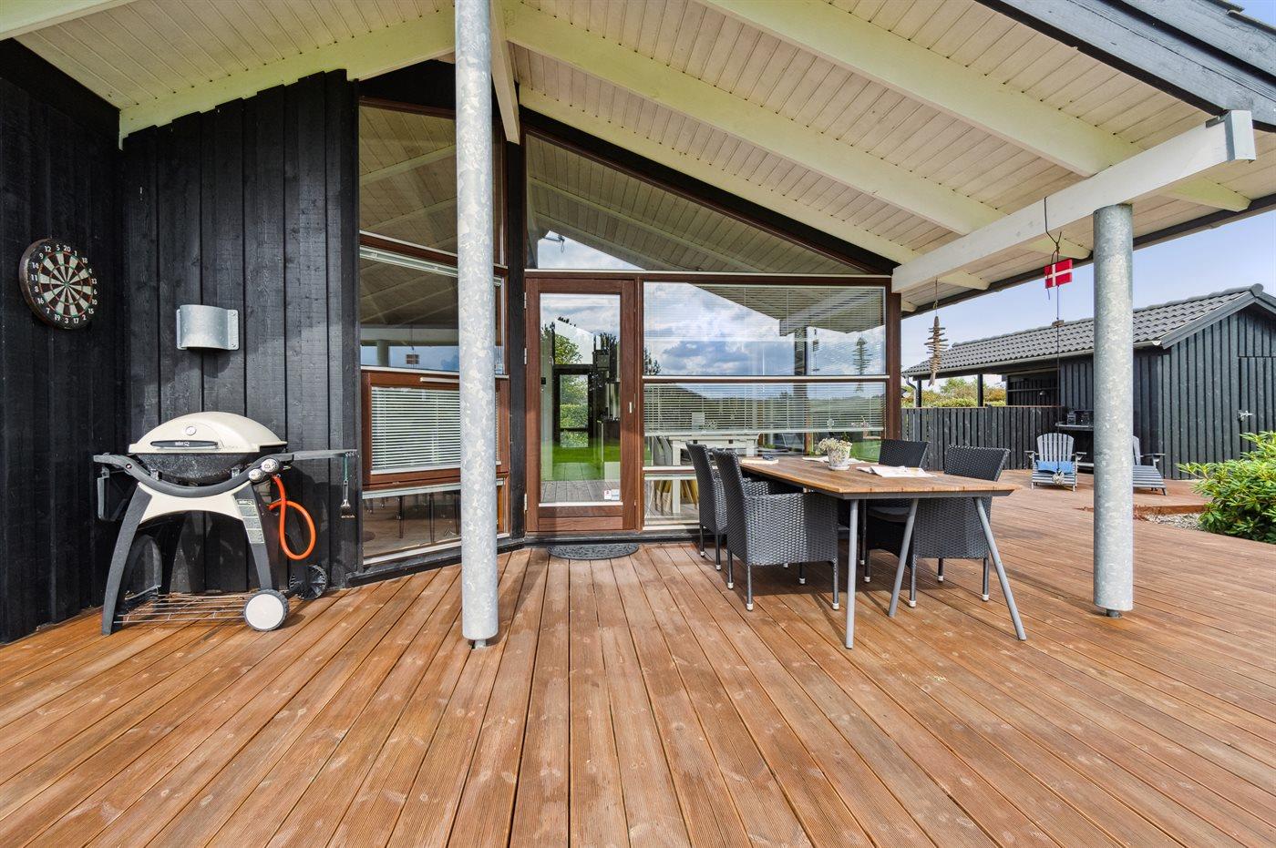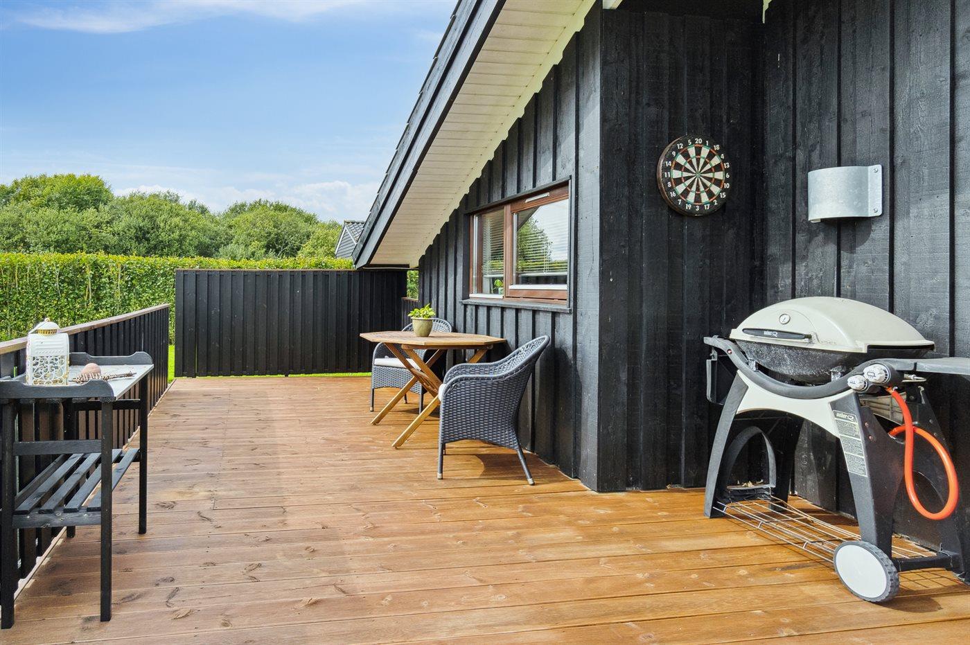 Ferieboligen er beliggende på en 1200 m² stor havegrund. Der er 400 m til havet. Nærmeste forretning er beliggende i en afstand af 3000 m. Til ferieboligen hører åbent terrasseareal. Desuden er der overdækket terrasse. Grill til rådighed. Der er carport til rådighed. Parkering ved ferieboligen.