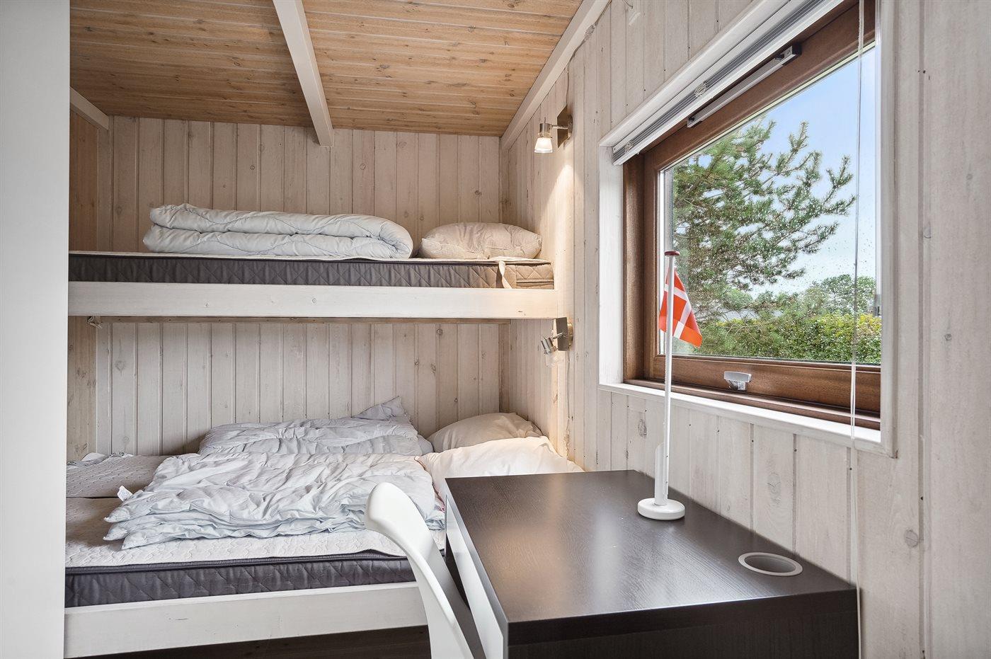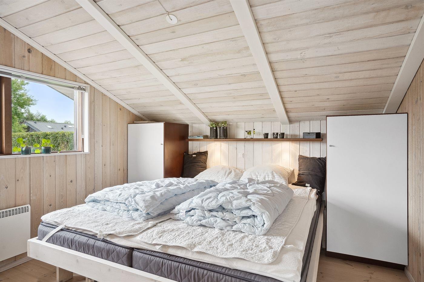 Der er i alt 3 soveværelser. Sovepladserne fordeler sig på: 2 sovepladser i dobbeltseng. 2 sovepladser i køjeseng.2 sovepladser i elevationssenge.
