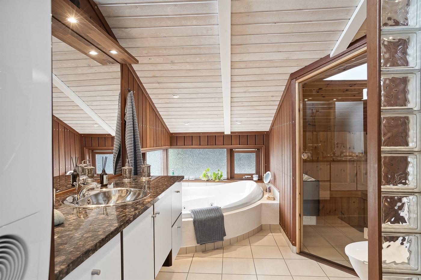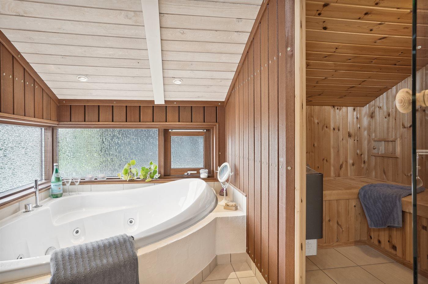 Der er 1 badeværelse med bruseniche og 1 toilet.. Der er gulvvarme på 1 badeværelse. I saunaen er der mulighed for afslapning.