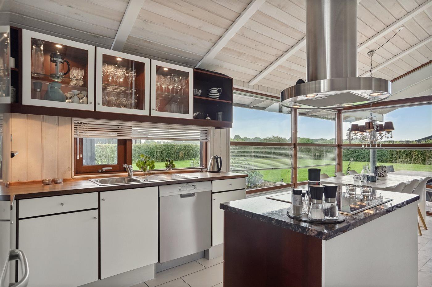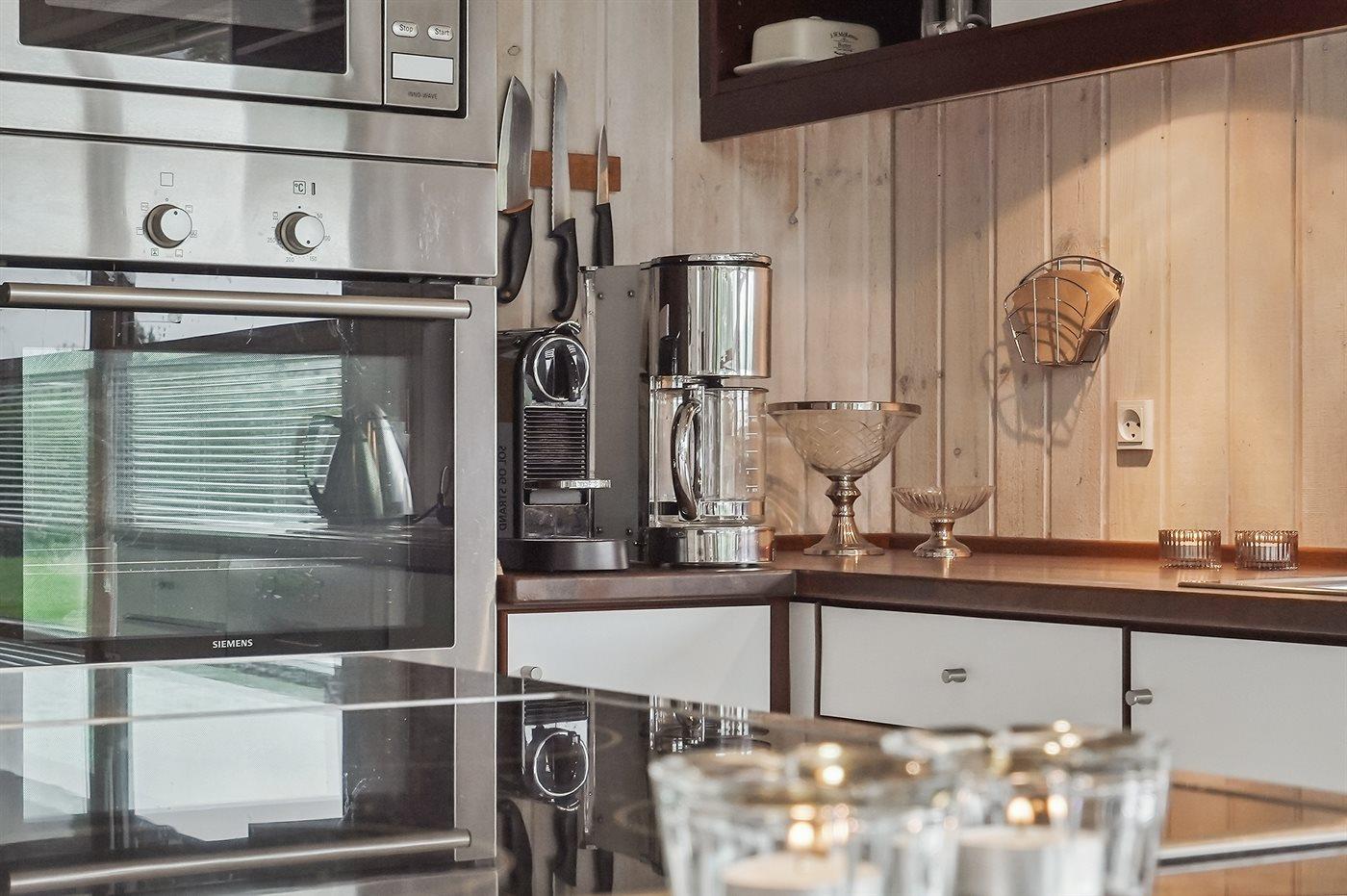 Køkkenet er udstyret med 1 køleskab. Der er 4 keramiske kogeplader, varmluftovn, mikrobølgeovn samt opvaskemaskine.