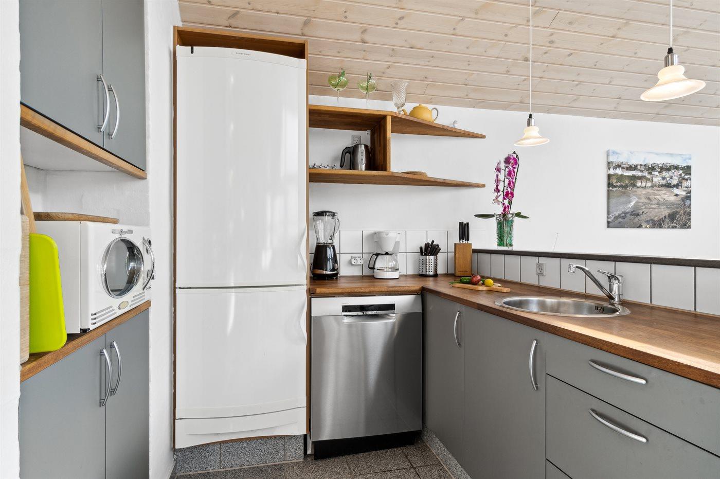 Køkkenet er udstyret med 1 køleskab. Der er 4 keramiske kogeplader, varmluftovn, mikrobølgeovn samt opvaskemaskine Der er gulvvarme i køkkenet.