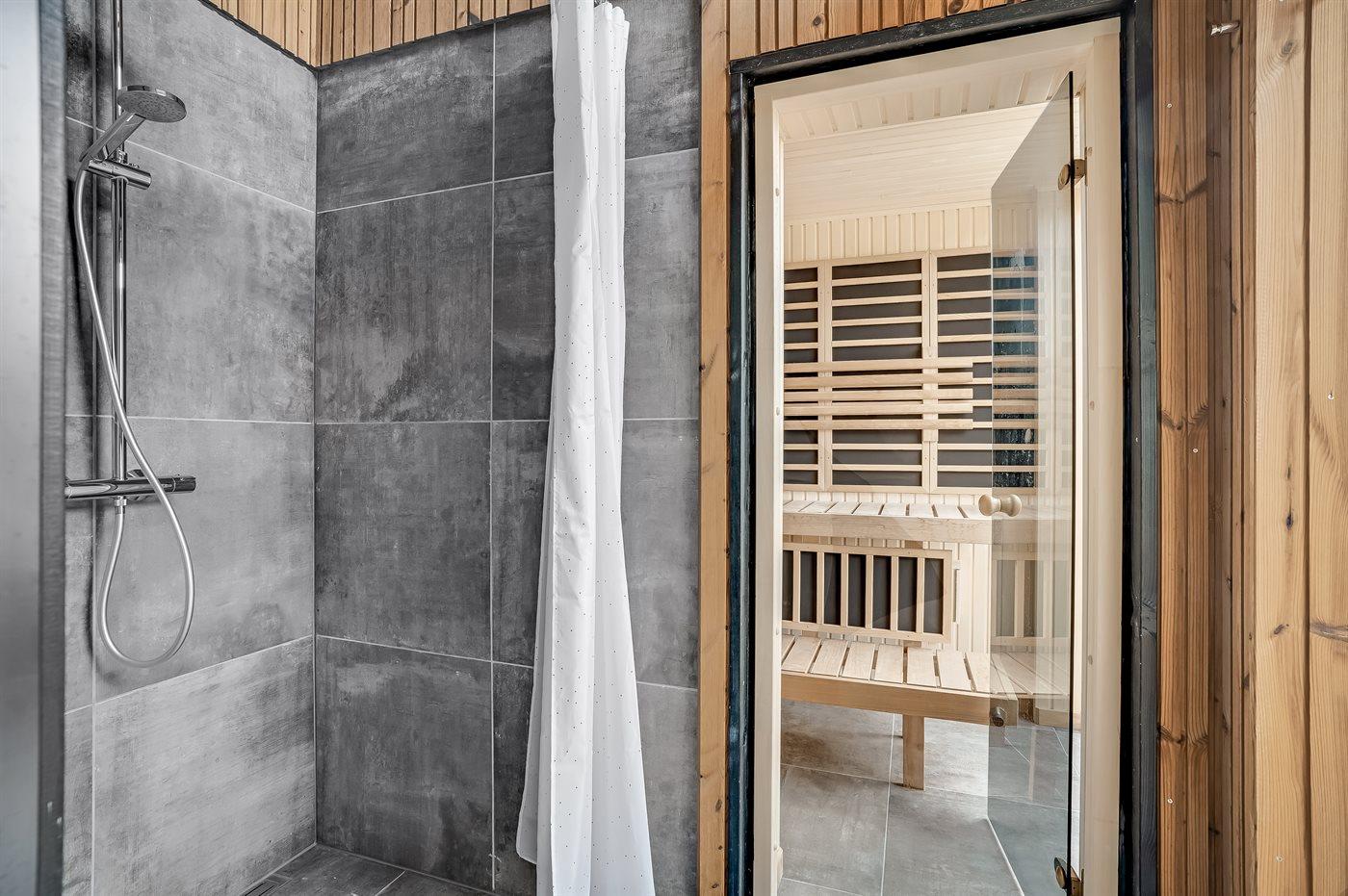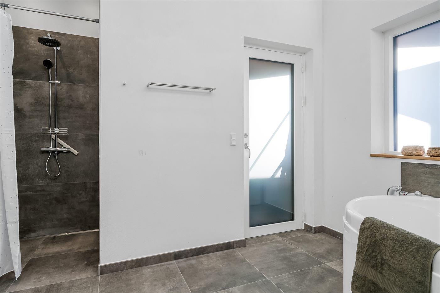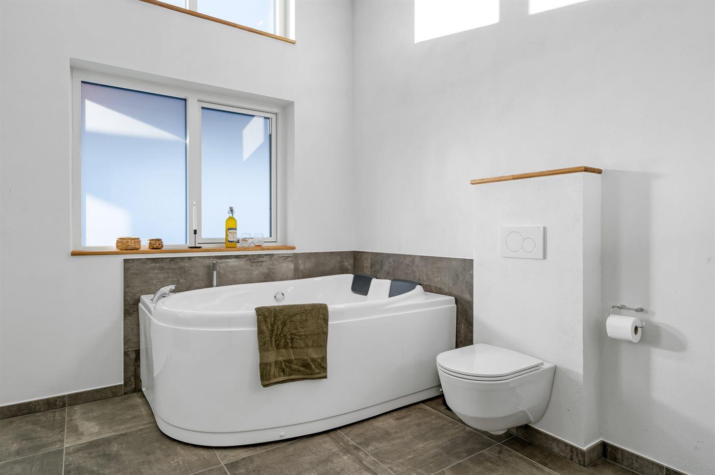 Huset har 2 badeværelser – det ene med bruseniche, og det andet som et luksusbadeværelse med spabad til 2 personer og med adgang til udesauna, udebruser samt til et udendørs standvandsspa til 6 personer. Perfekt til afslapning efter en dag ved stranden eller i naturen.