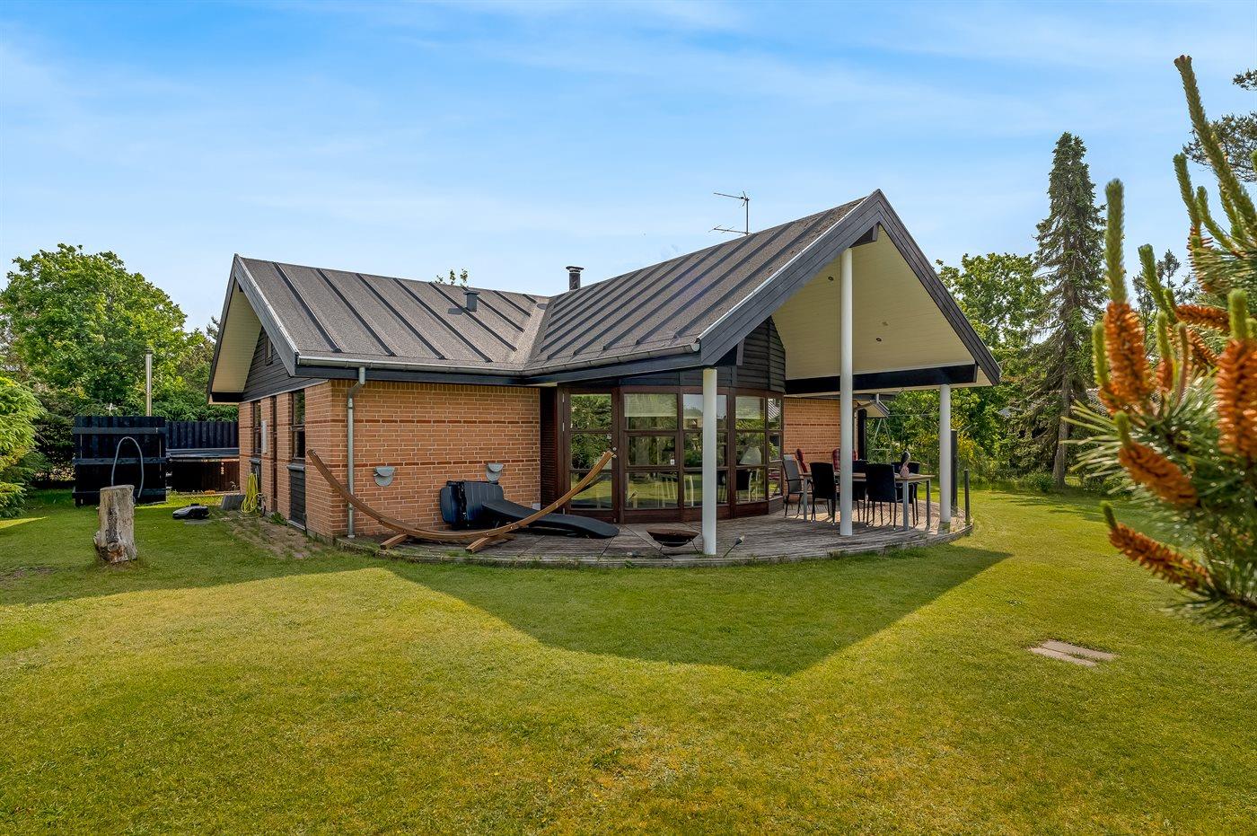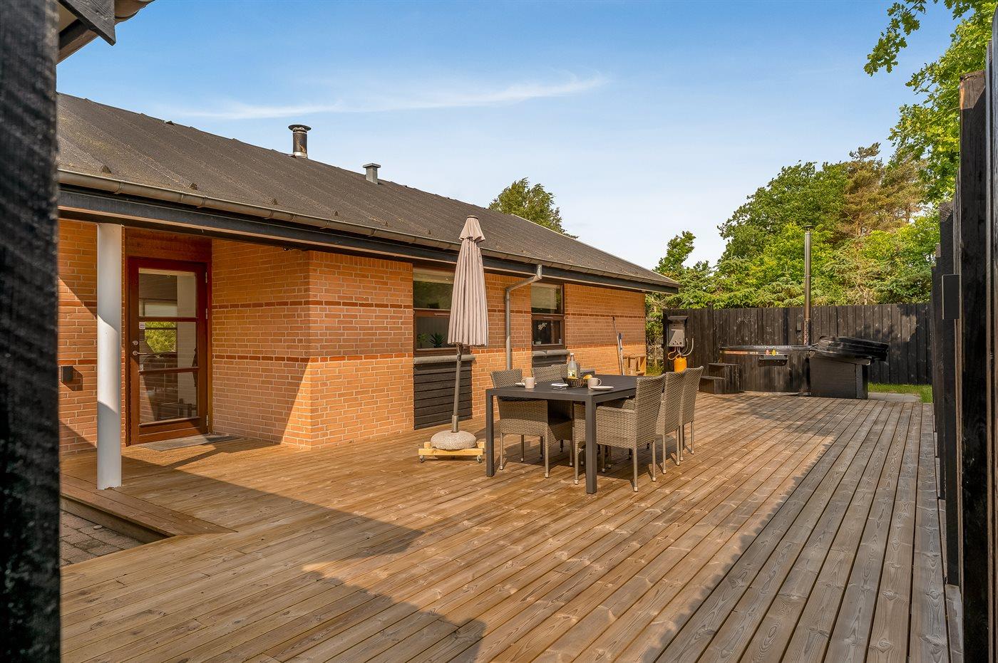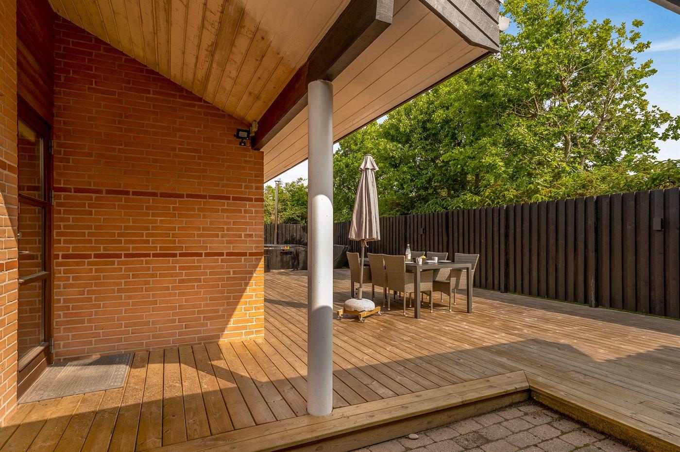 Her kan I nyde både solrige og kølige aftener på den rummelige terrasse eller under den overdækkede terrasse. Der er en grill til hyggelige middage under åben himmel, og den store græsplæne giver masser af plads til boldspil og leg.