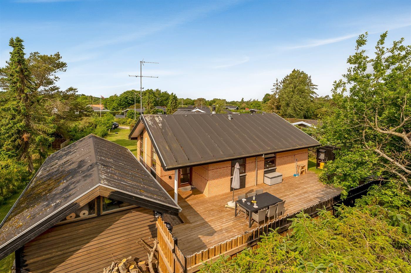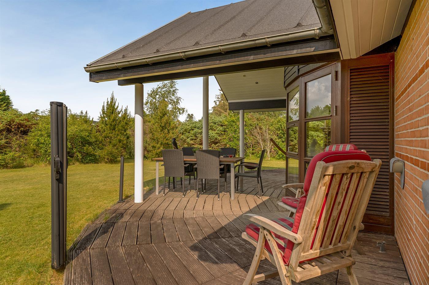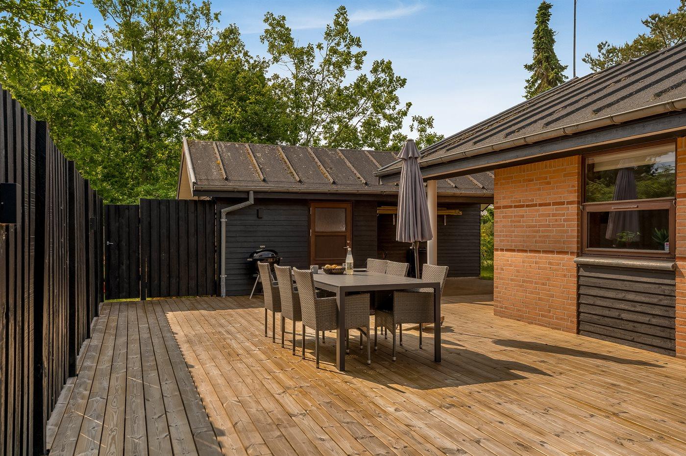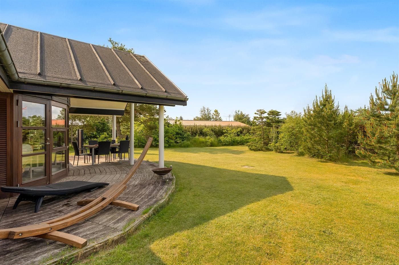 Her kan I nyde både solrige og kølige aftener på den rummelige terrasse eller under den overdækkede terrasse. Der er en grill til hyggelige middage under åben himmel, og den store græsplæne giver masser af plads til boldspil og leg.