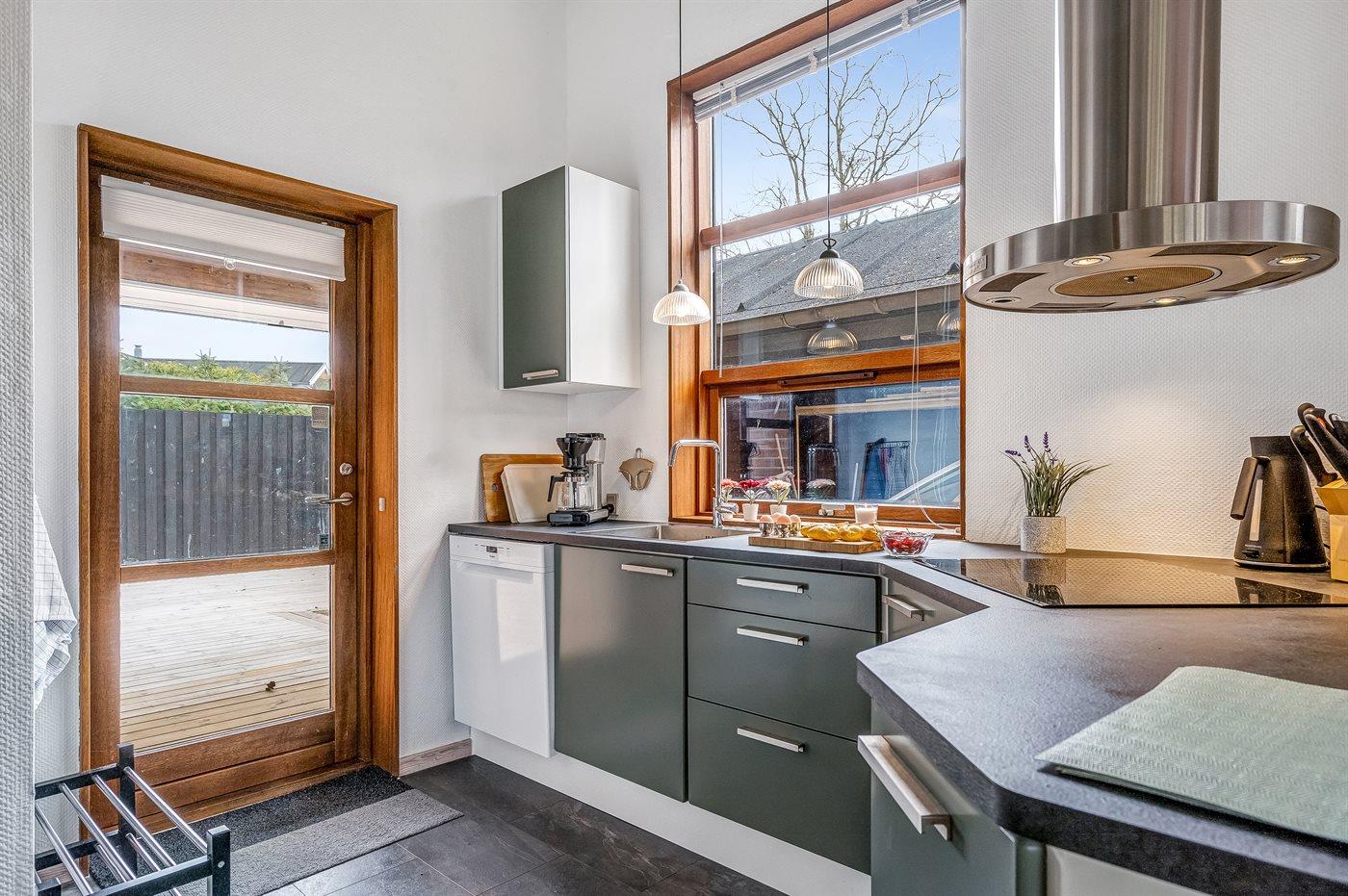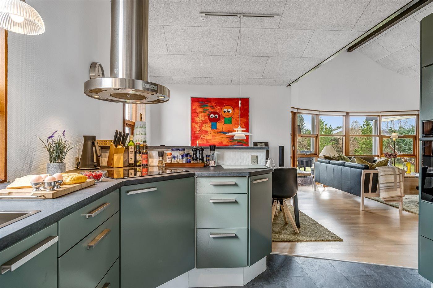 Køkkenet er udstyret med 1 køleskab. Der er 4 induktionskogeplader, varmluftovn, mikrobølgeovn samt opvaskemaskine.