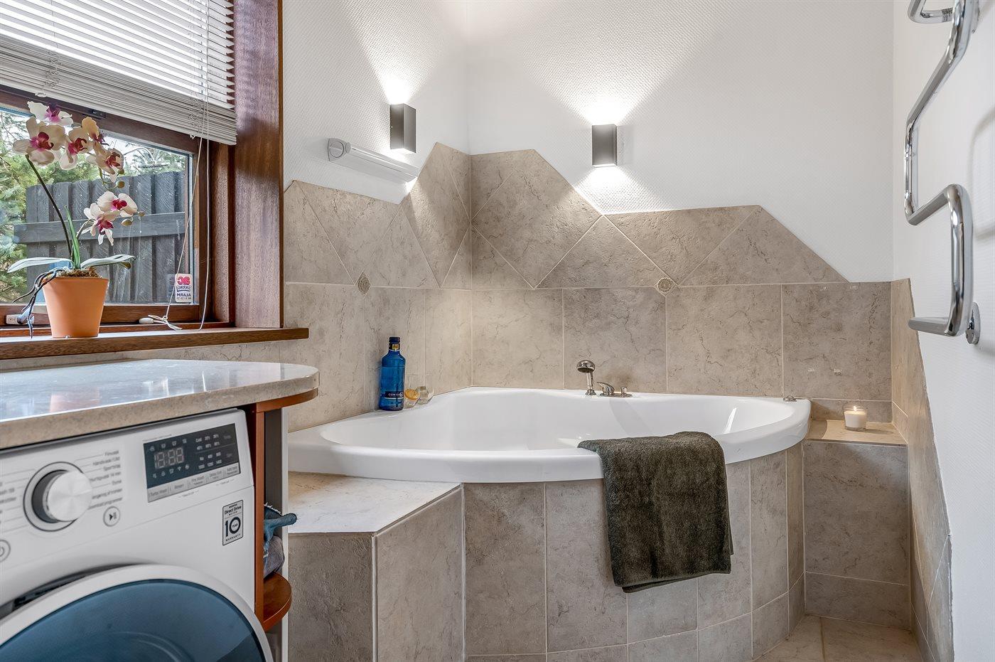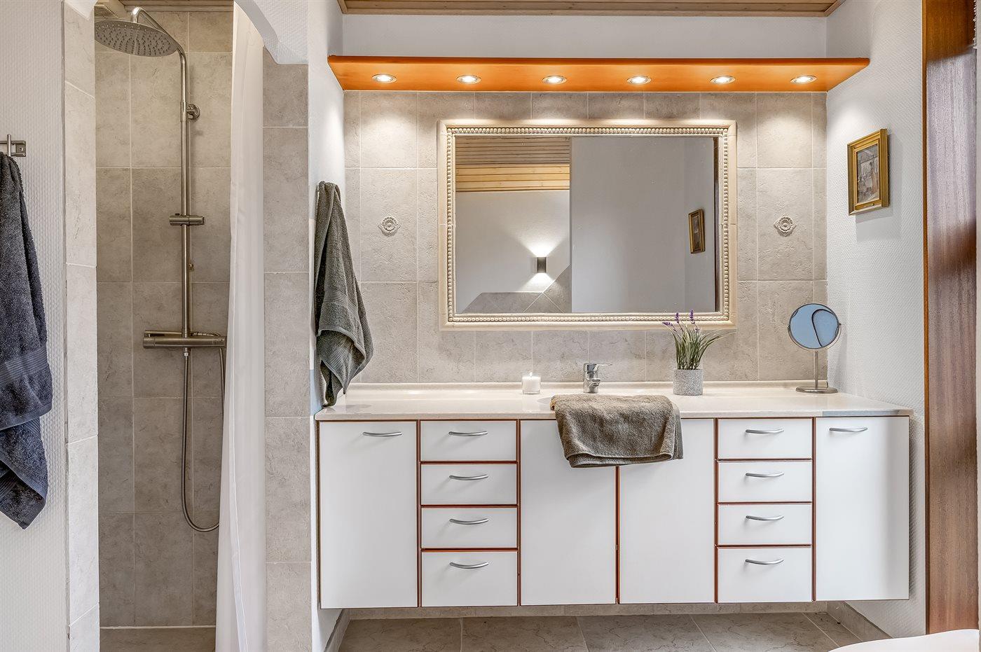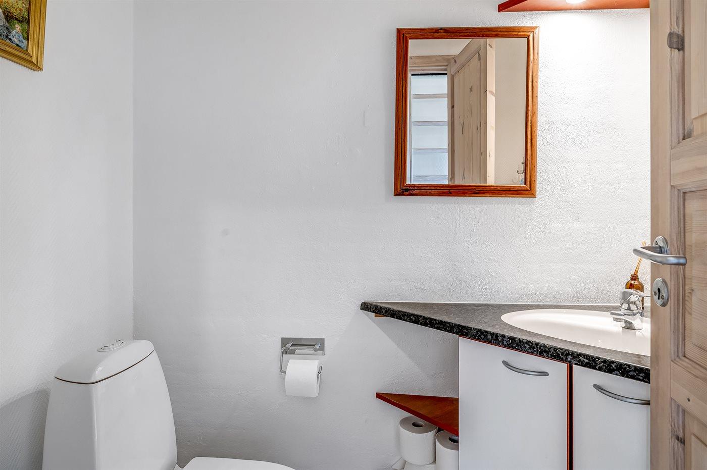 Der er 1 badeværelse med bruseniche og 2 toiletter, heraf 1 gæstetoilet. Der er gulvvarme på 1 badeværelse. Der er gulvvarme på gæstetoilettet.