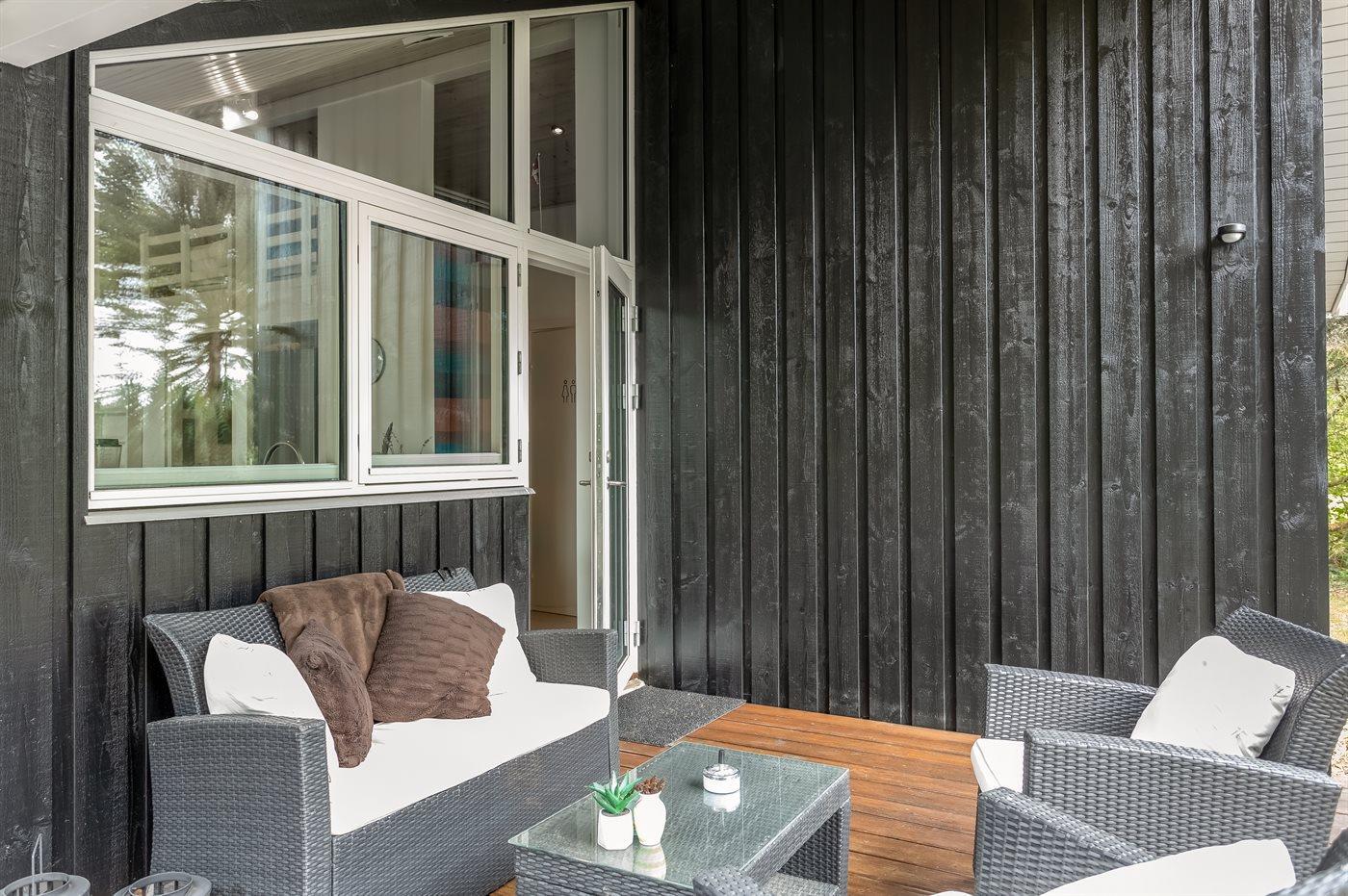 Charmerende sommerhus nær stranden med spa og to overdækkede terrasser for afslapning og hygge.