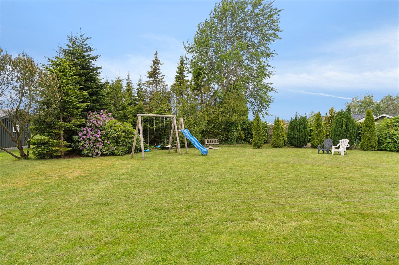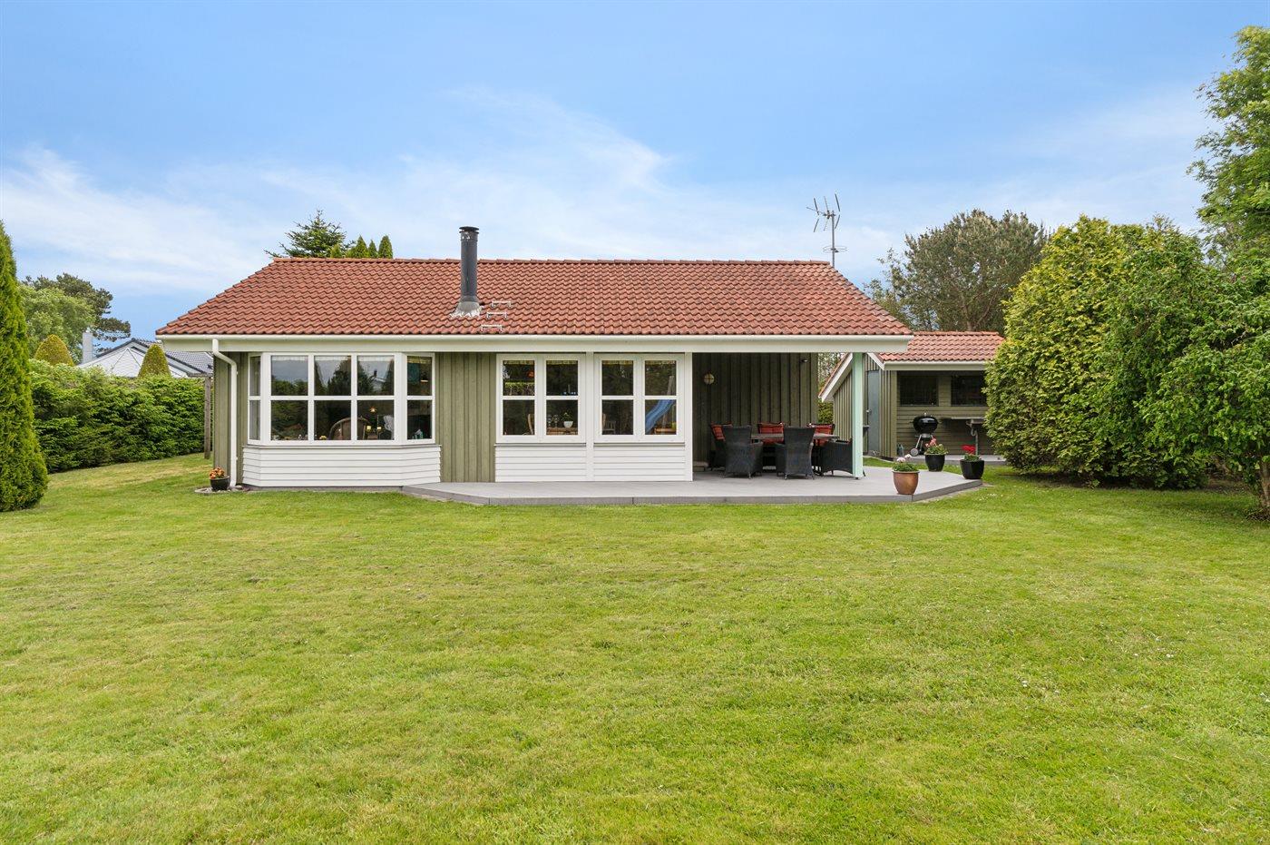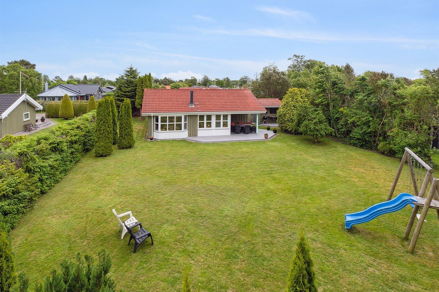 Ferieboligen er beliggende på en 950 m² stor havegrund. Der er 650 m til havet. Der er 12300 m til fjorden. Nærmeste forretning er beliggende i en afstand af 1290 m. Der er en golfbane i en afstand af 15150 m. Til ferieboligen hører åbent terrasseareal. Desuden er der overdækket terrasse. Gynge. Rutchebane. Bålsted. Grill til rådighed. Parkering ved ferieboligen.