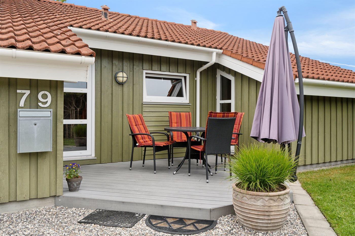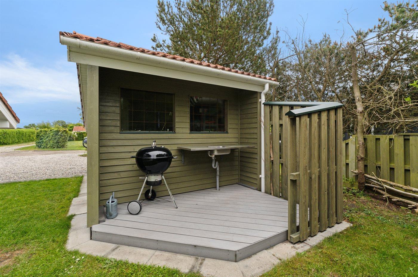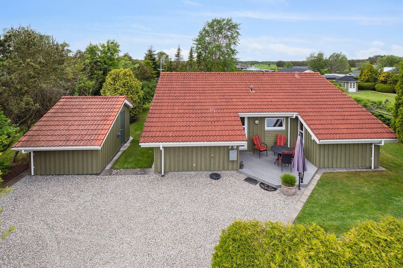 Ferieboligen er beliggende på en 950 m² stor havegrund. Der er 650 m til havet. Der er 12300 m til fjorden. Nærmeste forretning er beliggende i en afstand af 1290 m. Der er en golfbane i en afstand af 15150 m. Til ferieboligen hører åbent terrasseareal. Desuden er der overdækket terrasse. Gynge. Rutchebane. Bålsted. Grill til rådighed. Parkering ved ferieboligen.