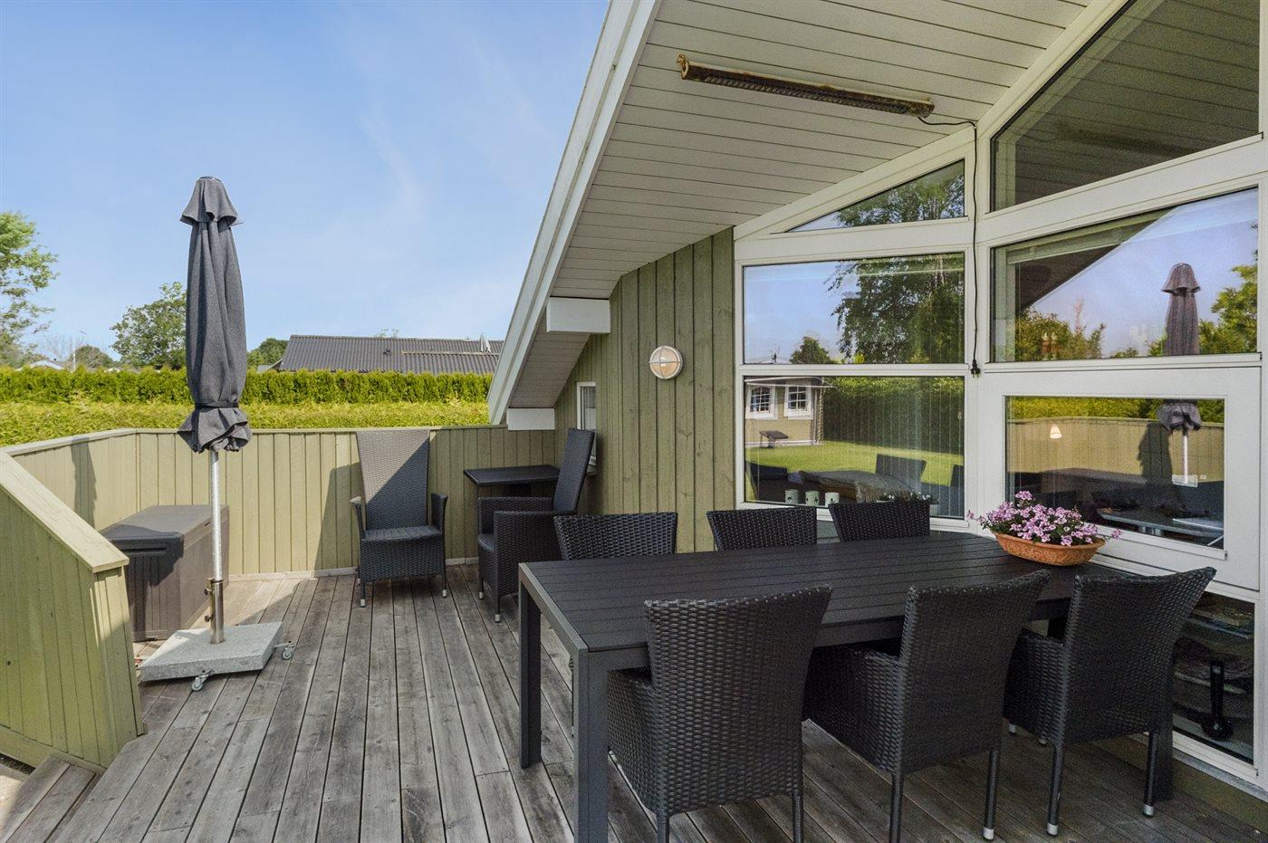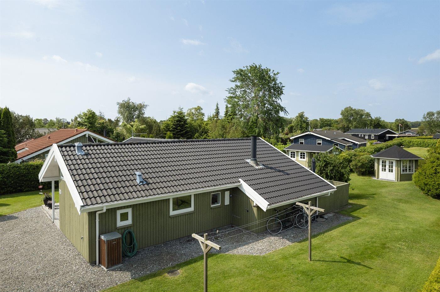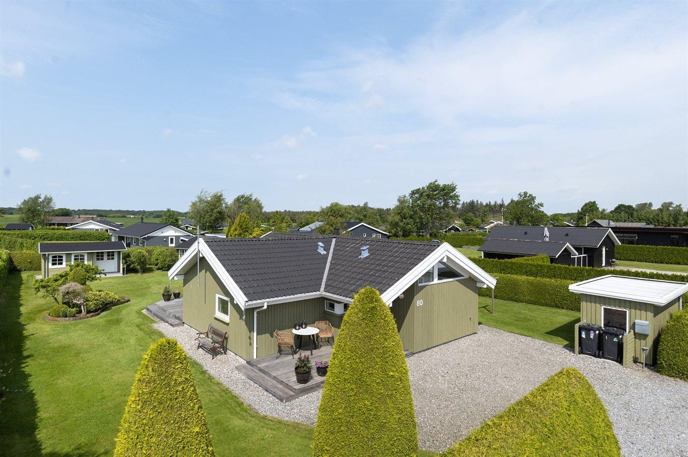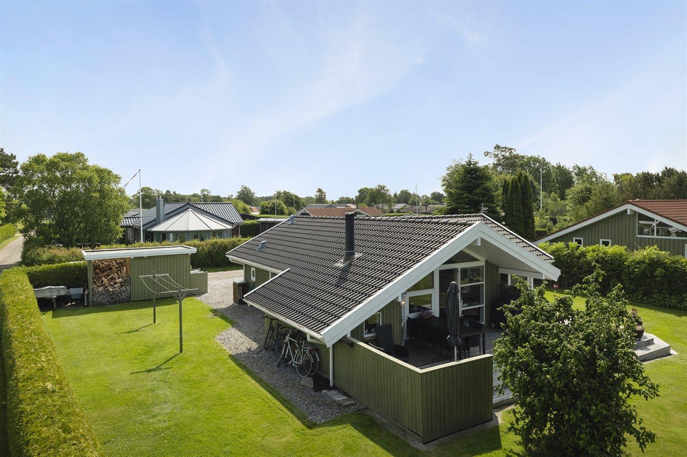 Ferieboligen er beliggende på en 850 m² stor naturgrund. Grunden er indhegnet. Der er 650 m til havet. Der er 12300 m til fjorden. Nærmeste forretning er beliggende i en afstand af 1290 m. Der er en golfbane i en afstand af 15150 m. Til ferieboligen hører åbent terrasseareal. Desuden er der overdækket terrasse. Gynge. Sandkasse. Trampolin. Rutchebane. Grill til rådighed. Der er installeret stik til opladning af elbil. Type 2 stik. Med 11 kW ladeeffekt. Parkering ved ferieboligen.