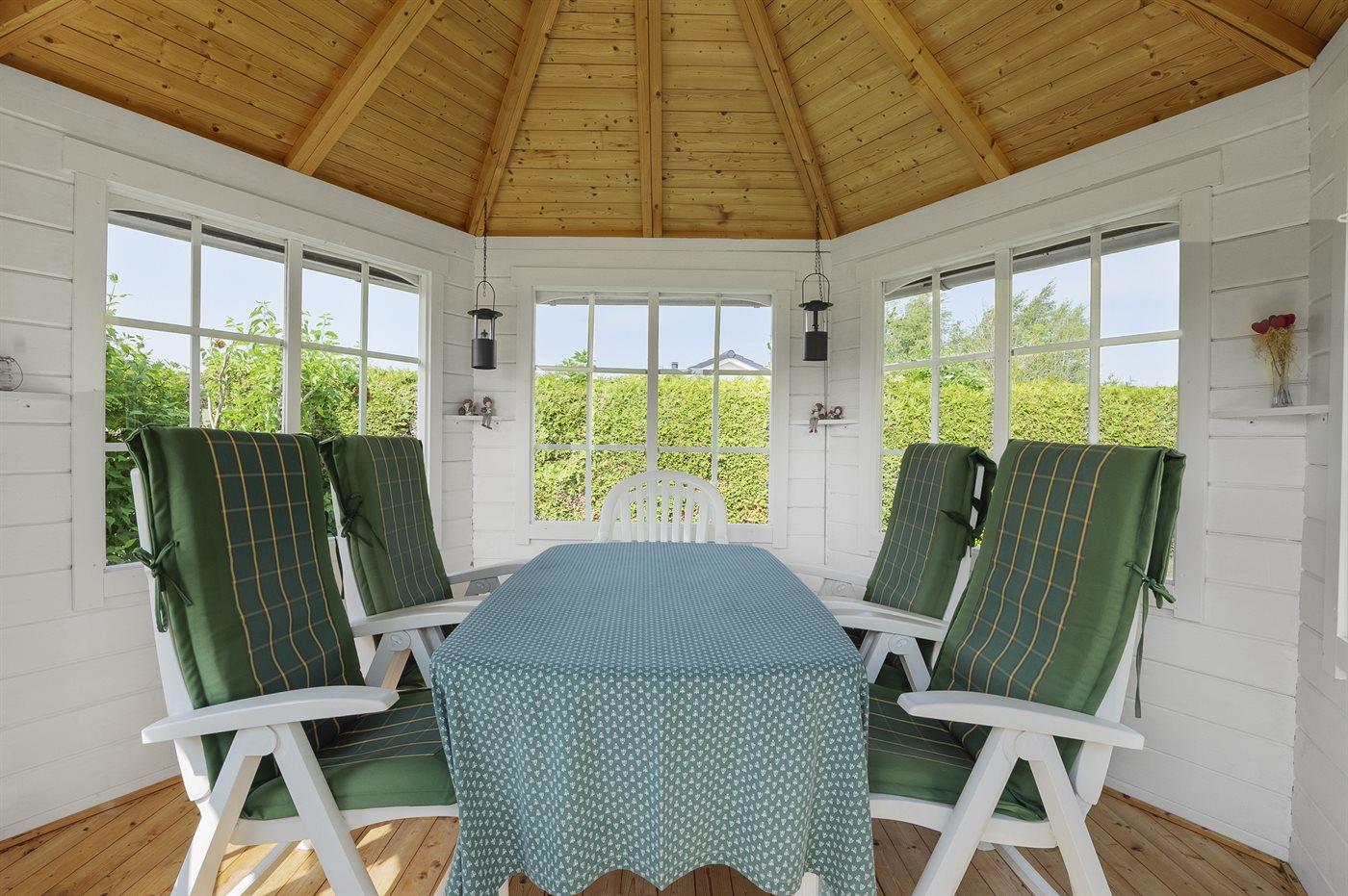 I den nederste del af haven finder du en charmerende pavillon – det perfekte sted til afslapning, hyggelige stunder eller en god kop kaffe, selv når aftenerne bliver lidt kølige.