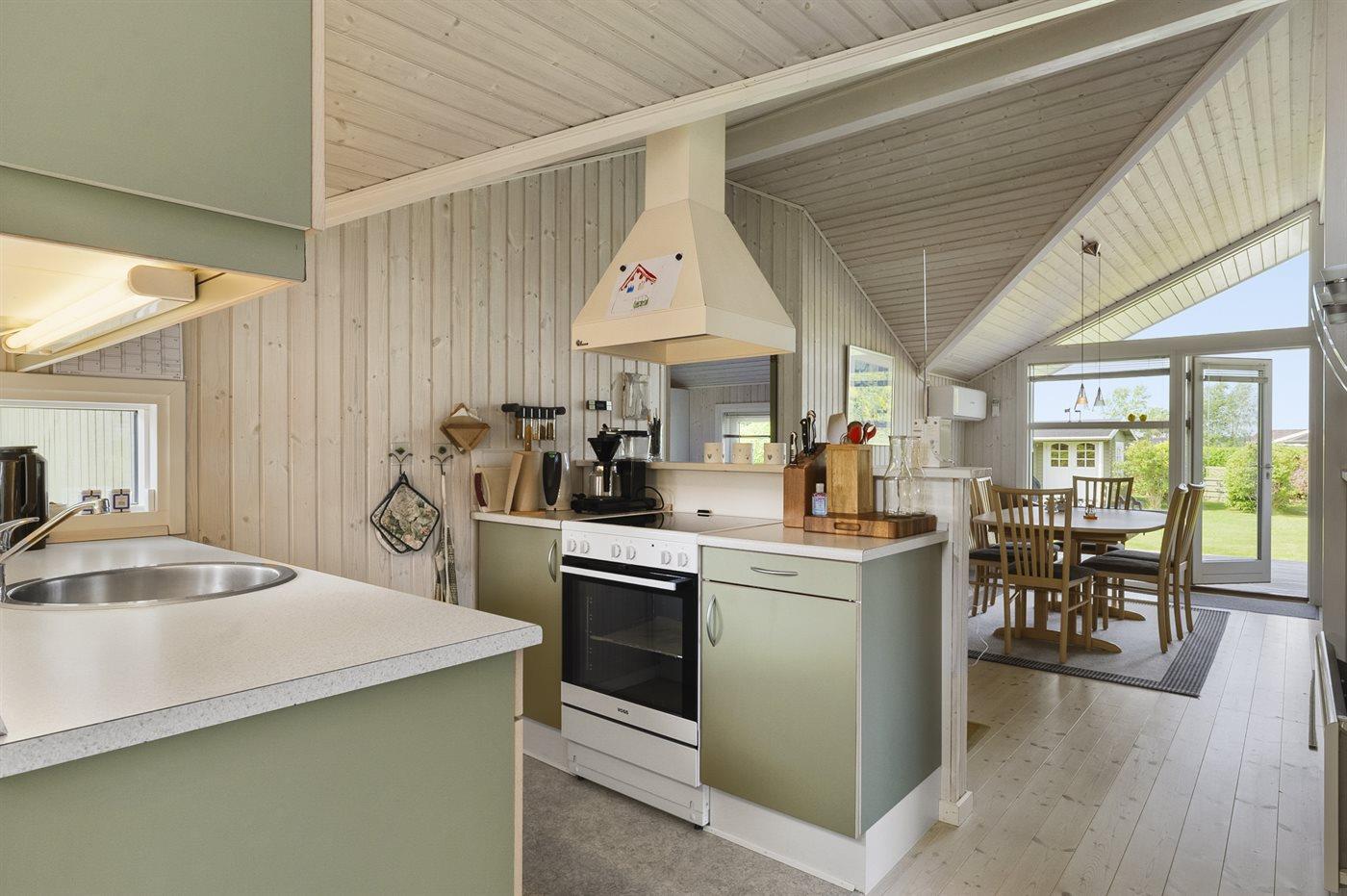 Køkkenet er udstyret med 1 køleskab. Der er 4 keramiske kogeplader, varmluftovn samt opvaskemaskine.