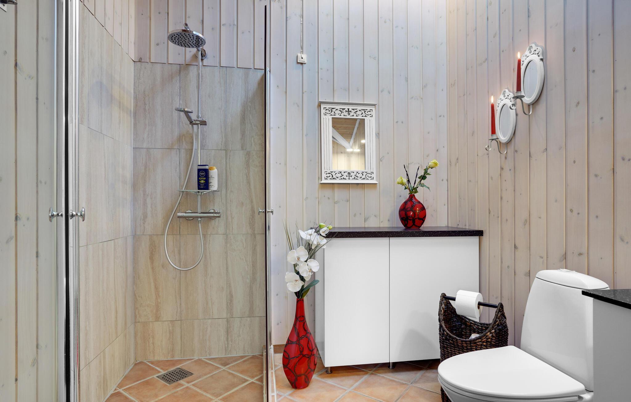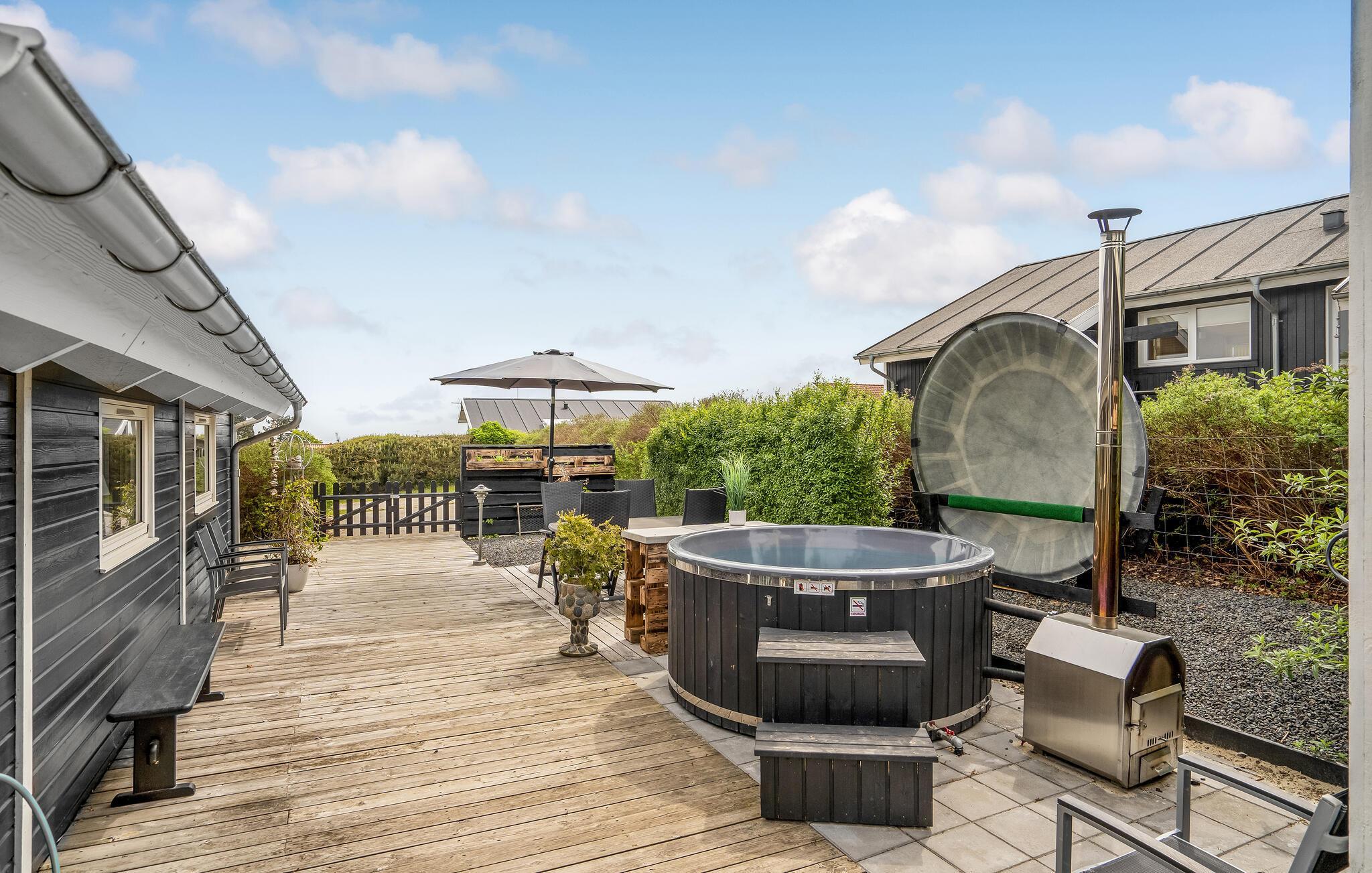 Hvis I trænger til at gøre det ekstra godt for jer selv efter en lang dag på farten, kan I tænde op i vildmarksbadet og nyde kombinationen af det varme vand og den kølige luft på en efterårsdag. På den overdækkede terrasse kan I virkelig nyde friluftslivet på de milde sommeraftener. Her står der både havemøbler og en grill klar, så I kan dække op til måltiderne udendørs.