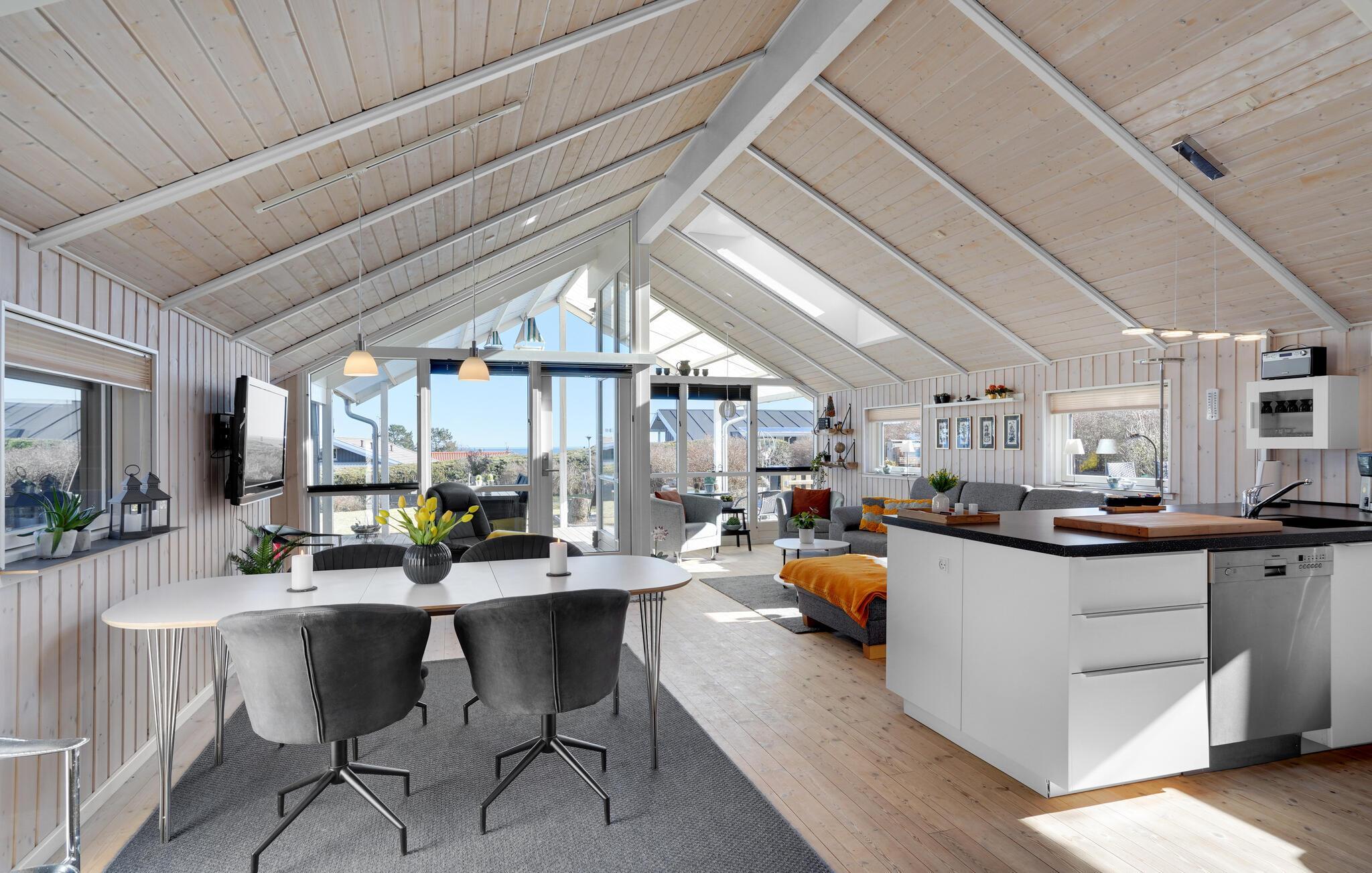 I dette lyse og moderne sommerhus kan I tilbringe en dejlig ferie med familien, som alle vil huske med glæde i lang tid. Der er tre soveværelser med komfortable dobbeltsenge og to badeværelser, så huset kan rumme seks personer. To kæledyr er også tilladt på ferien. Hjertet i huset er det veludstyrede køkken, der ligger i åben forbindelse med stuen. Der strømmer masser af lys ind gennem de store vinduer, og I har en vidunderlig udsigt over vandet.