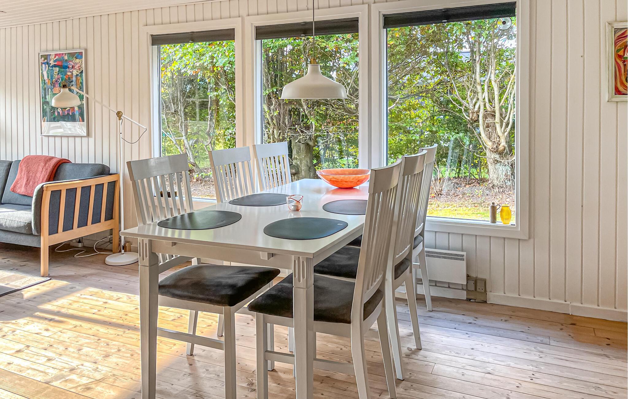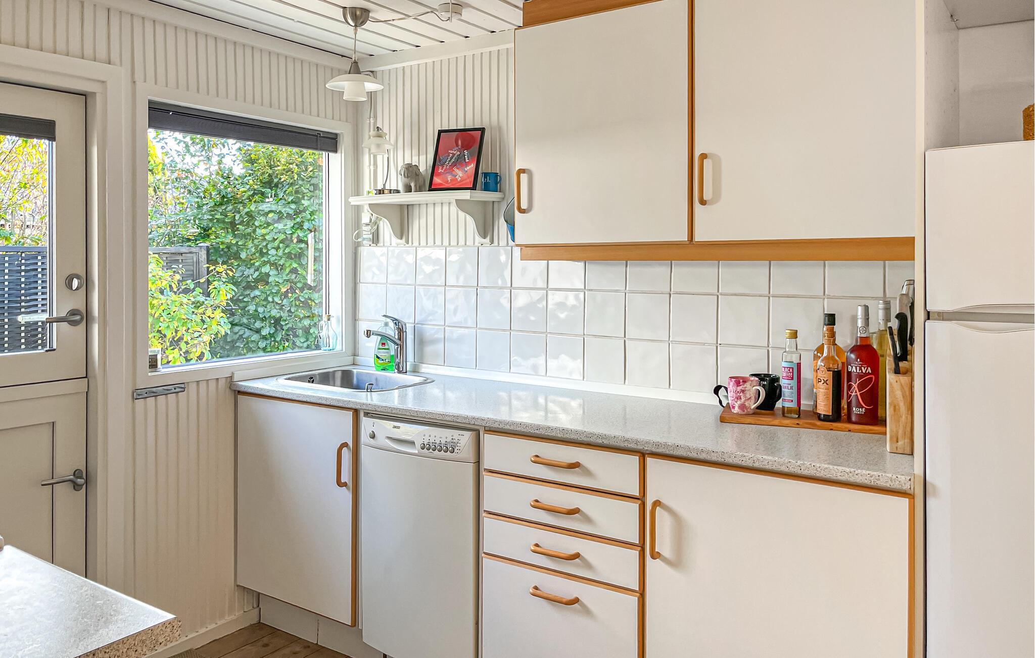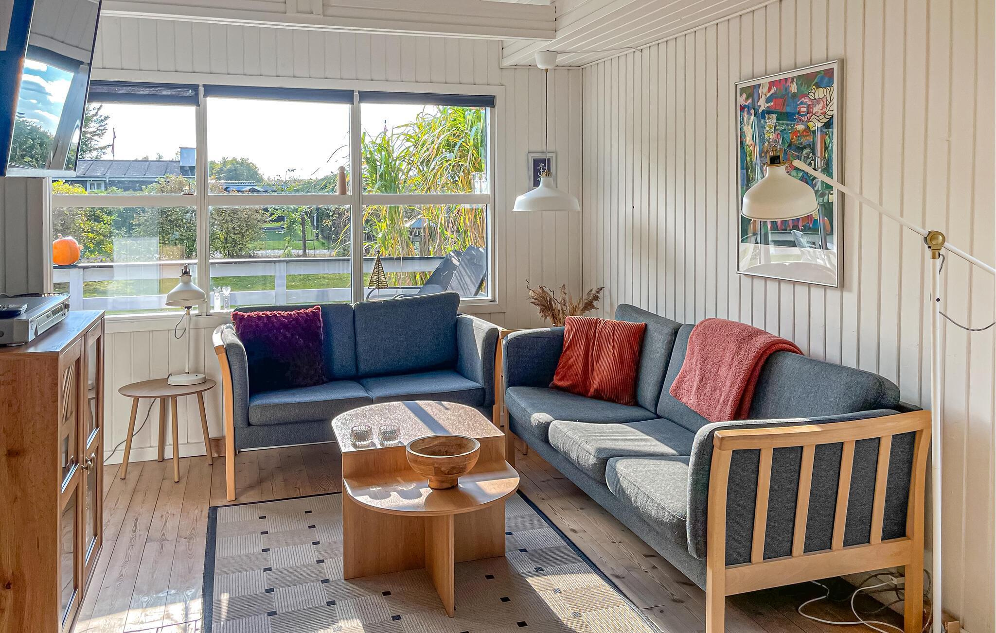 Træd ind i den lyse opholdsstue i jeres feriehus og nyd den indbydende atmosfære. Store vinduer lukker masser af naturligt lys ind og tilbyder udsigt over haven. Sæt jer godt til rette i de komfortable sofaer, mens brændeovnen sørger for en hyggelig varme på kølige dage. Indretningen kombinerer klassiske træelementer med lyse farver, hvilket skaber en behagelig og indbydende atmosfære. Den tilstødende spiseplads tilbyder rigelig plads til fælles måltider, spil eller hyggelige aftener. Det veludstyrede køkken med sine praktiske arbejdsflader og direkte adgang til terrassen gør madlavningen nem og fornøjelig.