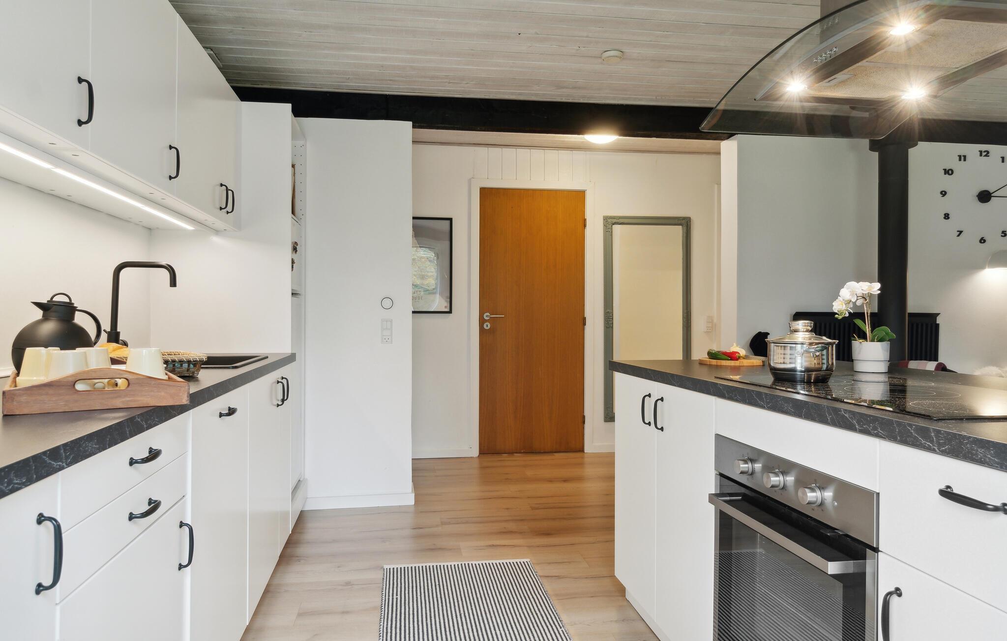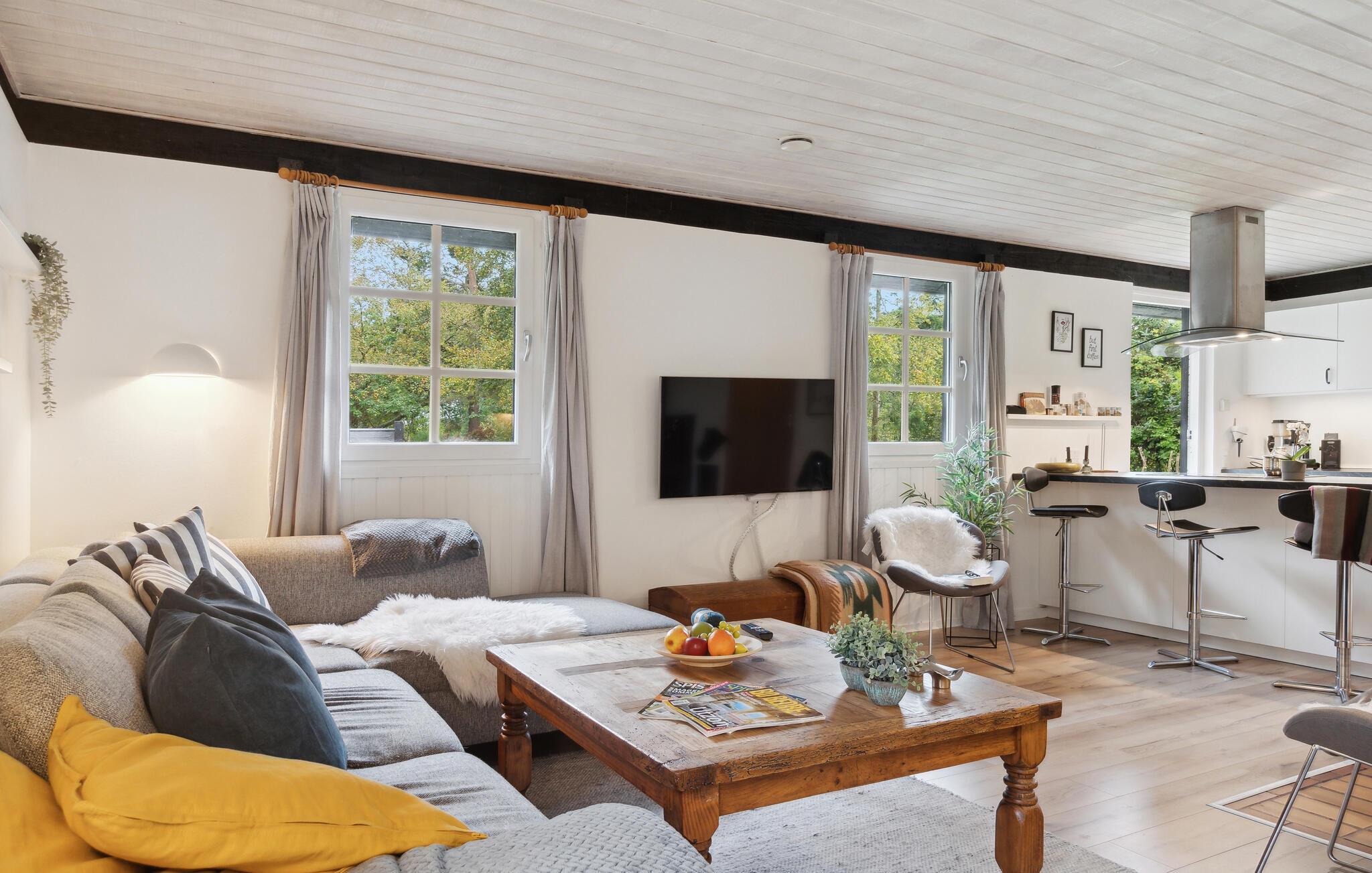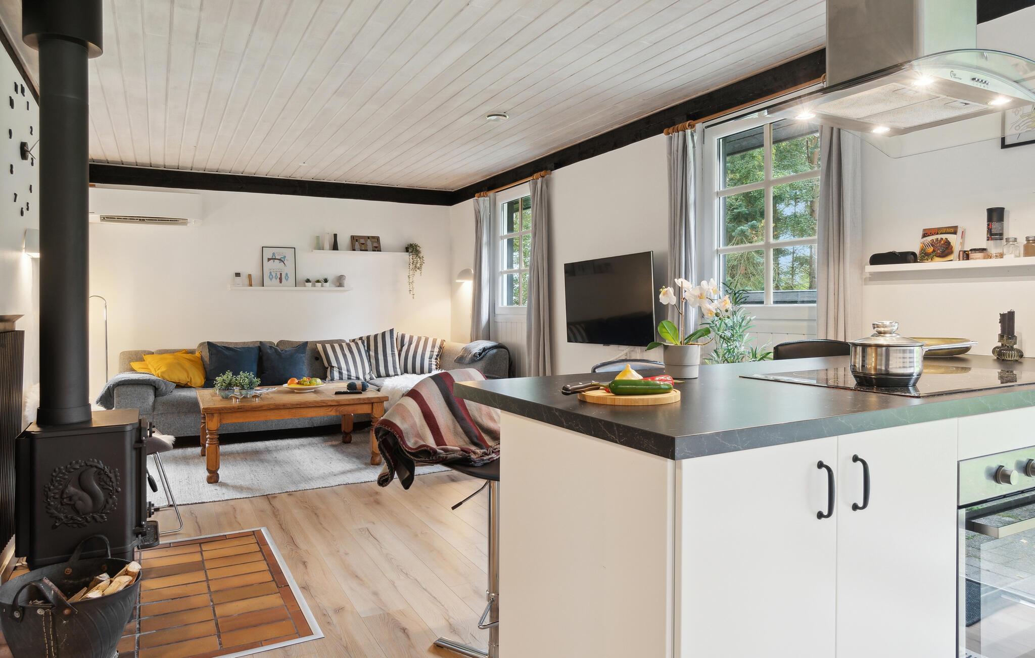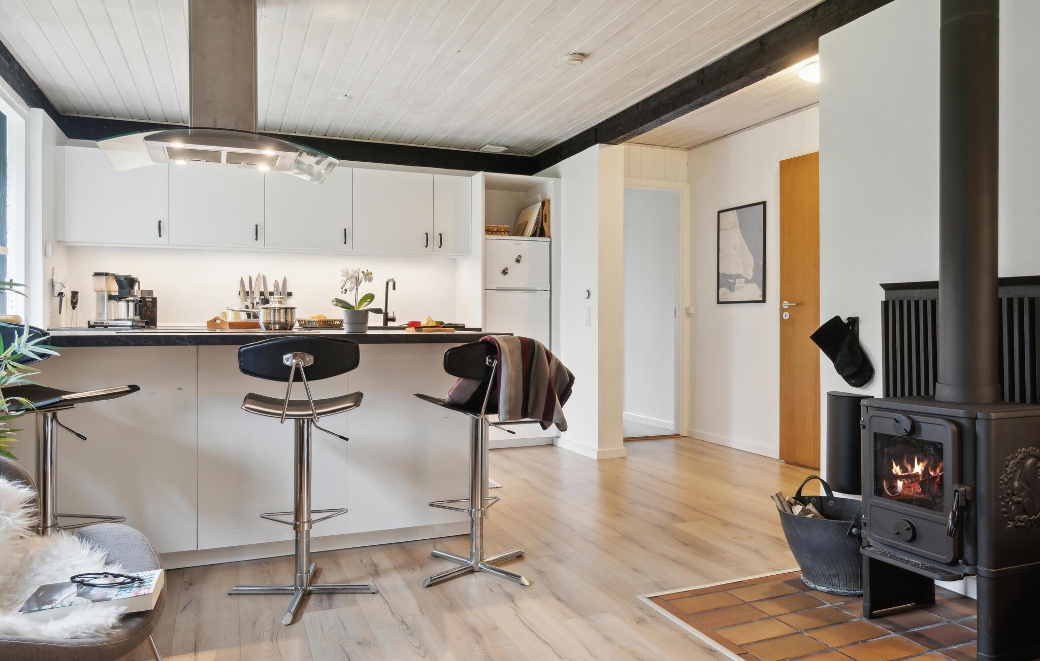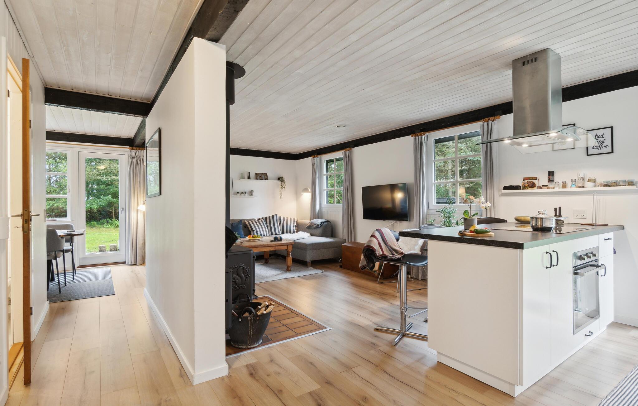 I midten af ??huset er den åbne opholdsstue og køkkenet med spiseplads, hvor I kan tilbringe hyggelige aftener med familie eller venner. Der er en madlavningsø i køkkenet, så I kan sidde her, mens feriekokken tilbereder lækre måltider til alle. På kølige dage spreder brændeovnen behagelig varme og ekstra hygge. Huset tilbyder også plads i tre soveværelser og et badeværelse.